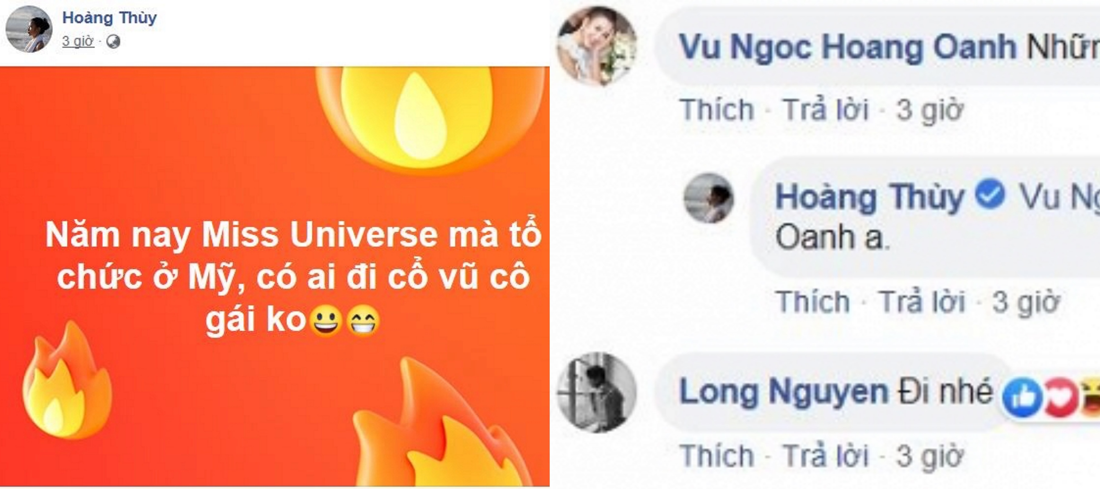 Mới đây, khi Hoàng Thuỳ dự đoán địa điểm thi Hoa hậu Hoàn Vũ 2019 tại Mỹ và thăm dò việc góp mặt cổ vũ của bạn bè, Rocker Nguyễn cũng là người nhanh chóng giơ tay xác nhận sẽ tham gia cổ vũ cô bạn thân.