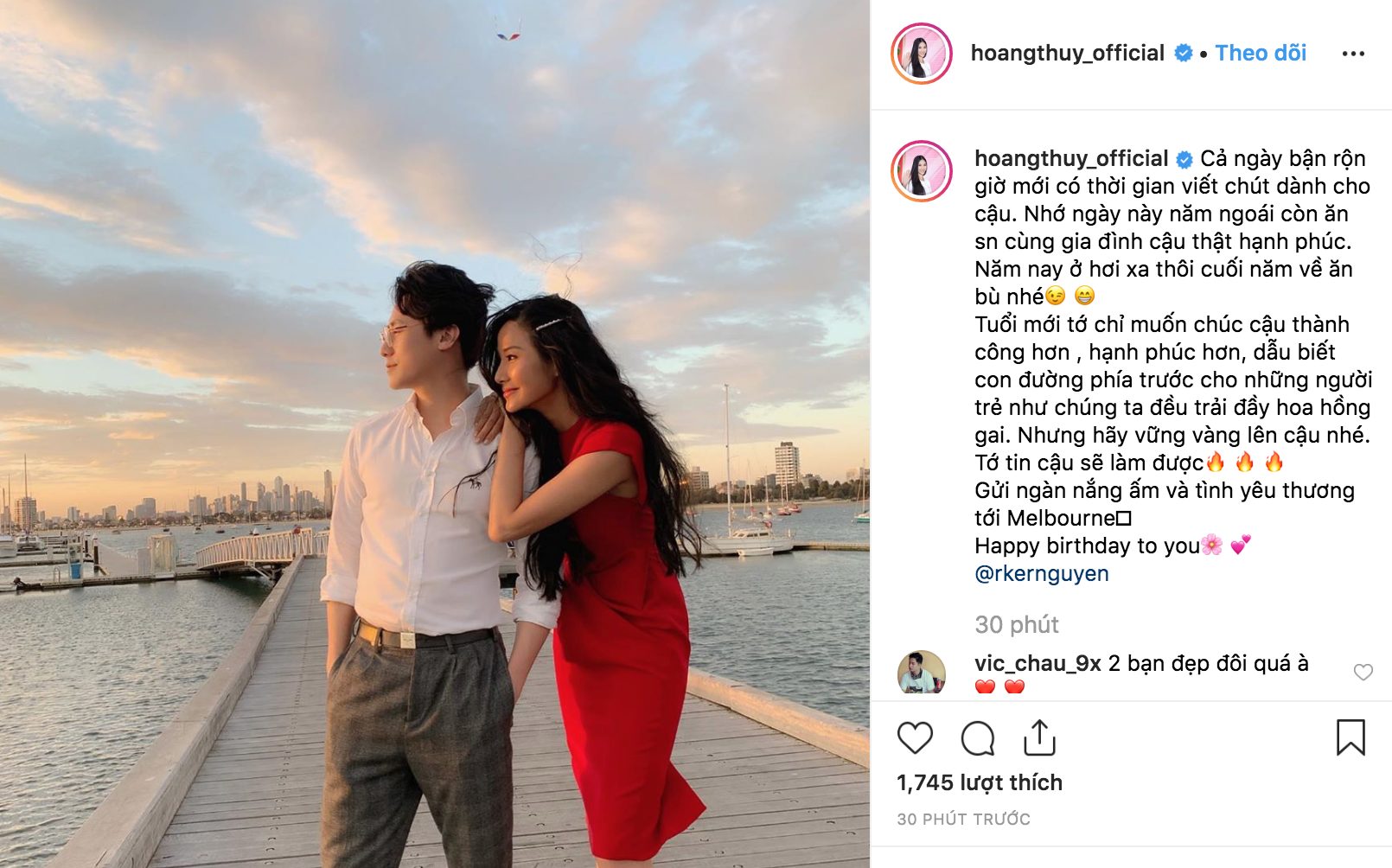 Cụ thể, Hoàng Thuỳ viết trên trang cá nhân: “Cả ngày bận rộn giờ mới có thời gian viết chút dành cho cậu. Nhớ ngày này năm ngoái còn ăn sinh nhật cùng gia đình cậu thật hạnh phúc. Năm nay ở hơi xa thôi cuối năm về ăn bù nhé. Tuổi mới tớ chỉ muốn chúc cậu thành công hơn, hạnh phúc hơn, dẫu biết con đường phía trước cho những người trẻ như chúng ta đều trải đầy hoa hồng gai. Nhưng hãy vững vàng lên cậu nhé. Tớ tin cậu sẽ làm được. Gửi ngàn nắng ấm và tình yêu thương tới Melbourne. Chúc mừng sinh nhật cậu“.