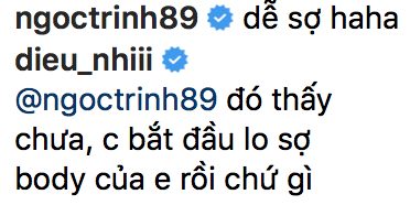 Sau những lời lẽ có phần nghiêm túc và tâm trạng, Nữ hoàng nội y - Ngọc Trinh tỏ thái độ “dễ sợ” đầy hài hước với người em thân thiết. Diệu Nhi liền tag thẳng Ngọc Trinh và nhắc nhở: “Đó thấy chưa, chị bắt đầu lo sợ body của em rồi chứ gì?”.