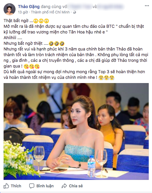 Nhưng rất vui và hạnh phúc khi 3 năm qua chính bản thân Thảo đã hoàn thành tốt và làm tròn trách nhiệm của bản thân. Không phụ lòng tất cả mọi người, gia đình, các anh chị truyền thông, các anh chị đã giúp đỡ Thảo trong thời gian qua! Dù kết quả ngoài sự mong đợi nhưng mong rằng Top 3 sẽ hoàn thiện hơn và hoàn thành tốt nhiệm vụ của chính mình nhé!”.