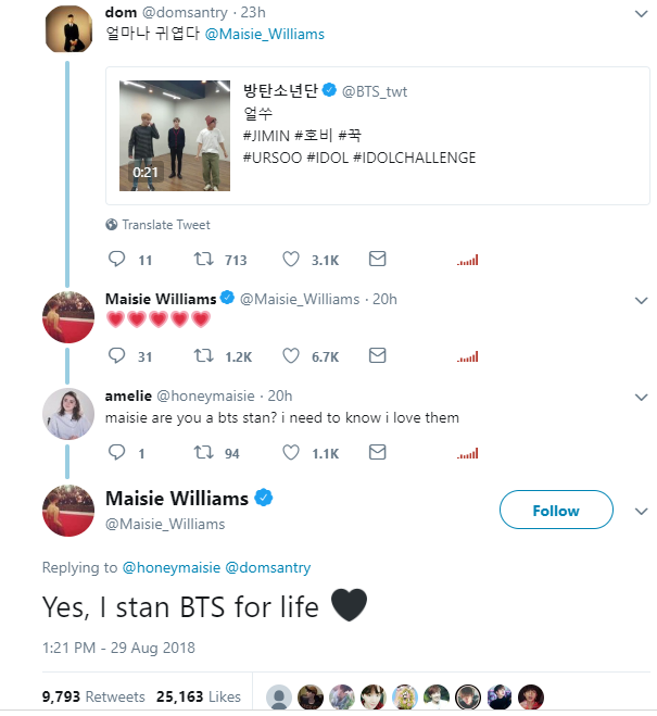 Maisie Williams nổi tiếng với vai diễn Arya Stark trong bộ phim truyền hình Mỹ Game of Thrones đã bày tỏ tình yêu của cô dành cho BTS.