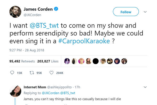 James Corden là người dẫn chương trình talkshow The Late Late Show with James Corden, mặc dù đã mời thành công BTS góp mặt trong show đến 2 lần nhưng anh chàng này còn “tham lam” muốn lần nào BTS có lịch trình ở Mỹ có thể đến talkshow của mình. Và James cũng bày tỏ rằng anh hy vọng BTS sẽ tham gia luôn show Carpool Karaoke ăn khách của mình.