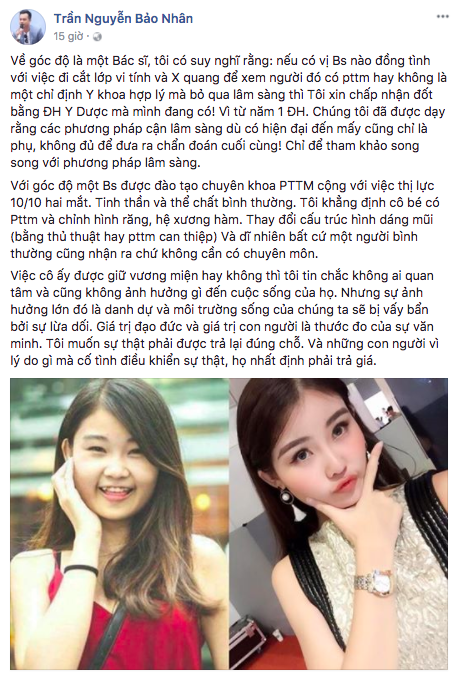 Anh khẳng định với góc độ một bác sĩ được đào tạo chuyên khoa phẫu thuật thẩm mỹ cộng với việc thị lực 10/10 hai mắt, tinh thần và thể chất bình thường thì “cô bé có phẫu thuật thẩm mỹ và chỉnh hình răng, hệ xương hàm. Thay đổi cấu trúc hình dáng mũi (bằng thủ thuật hay phẫu thuật thẩm mỹ can thiệp) và dĩ nhiên bất cứ một người bình thường cũng nhận ra chứ không cần có chuyên môn”.