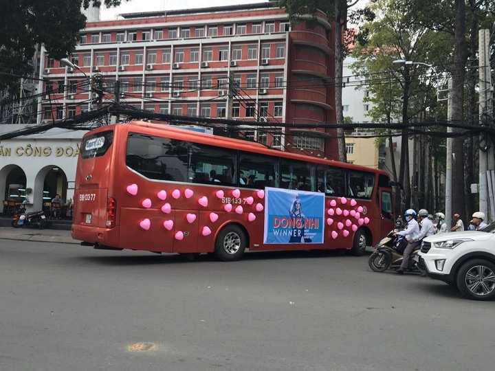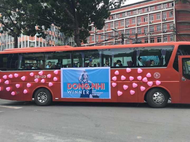 Trước đó, FC Đông Nhi thuê hẳn một chiếc xe buýt màu đỏ, trang trí bong bóng màu hồng cùng băng rôn chúc mừng thần tượng nổi bật chạy trên phố và thu hút sự chú ý của nhiều người.