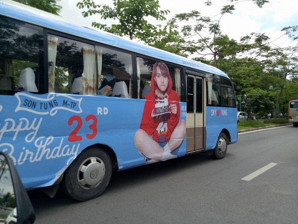 Để mừng thần tượng - Sơn Tùng M-TP bước sang tuổi 23, cộng đồng fan miền Bắc của nam ca sĩ đã không ngần ngại thuê 3 chiếc xe bus hoành tráng để in hình anh cùng ngày sinh chạy dọc theo xe. Được biết, 3 chiếc xe bus này di chuyển đến nhiều địa điểm quanh Hà Nội và các fan còn thực hiện những màn đồng diễn cực ngầu.