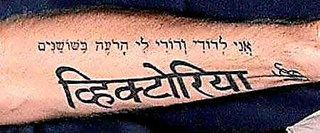 Vào dịp kỷ niệm 6 năm ngày cưới, David và Victoria Beckham cùng xăm hình một dòng chữ Do Thái giống hệt nhau. Trong khi chàng cầu thủ đẹp trai xăm dòng chữ này lên cánh tay của mình thì Victoria lại quyết định đặt chúng ở một vị trí chạy dọc theo chiều dài từ cổ xuống lưng. Hình xăm có nghĩa “I am my beloved’s and my beloved is mine”, tạm dịch là “Tôi thuộc về người tôi yêu và người yêu tôi thuộc về tôi”.
