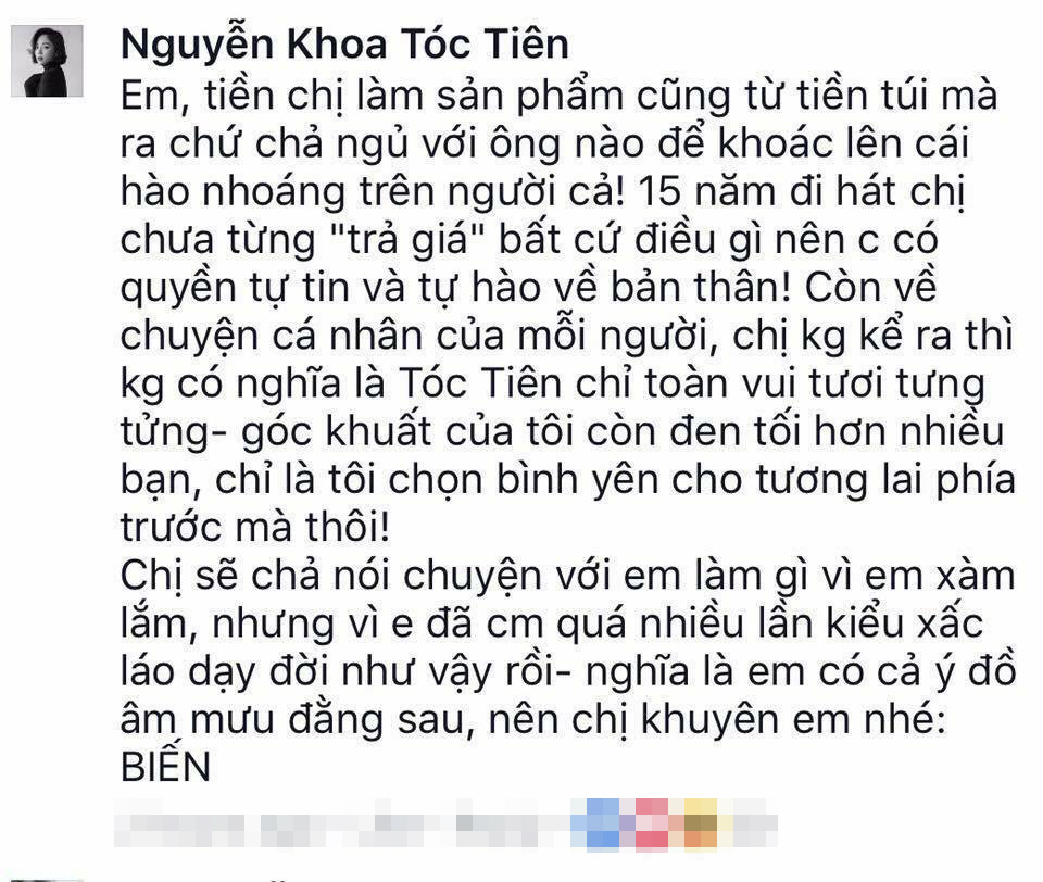 Dĩ nhiên, Tóc Tiên cũng “không phải dạng vừa đâu”, cô thẳng thắn đáp trả lại anti-fan này: “Em, tiền chị làm sản phẩm cũng từ tiền túi mà ra chứ chả ngủ với ông nào để khoác lên cái hào nhoáng trên người cả. 15 năm đi hát, chị chưa từng 'trả giá' bất cứ điều gì nên chị có quyền tự tin và tự hào về bản thân. Còn về chuyện cá nhân mỗi người, chị không kể ra thì không có nghĩa là Tóc Tiên chỉ toàn vui tươi, tưng tửng - góc khuất của tôi còn đen tối hơn nhiều bạn, chỉ tôi chọn bình yên cho tương lai phía trước mà thôi!