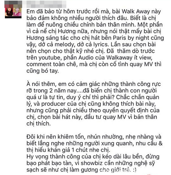 Theo đó, một khán giả bất ngờ để lại dòng bình luận khá dài trên Facebook Tóc Tiên cho rằng MV Walk Away của cô không thành công vì nữ ca sĩ làm là để nuông chiều bản thân mình. Đồng thời, người này cho rằng chính thành công trong 2 năm qua đã biến Tóc Tiên thành người quá tự tin. Và còn khuyên nữ ca sĩ nên biết nhún nhường, khiêm tốn, nhẹ nhàng và biết lắng nghe những người xung quanh.