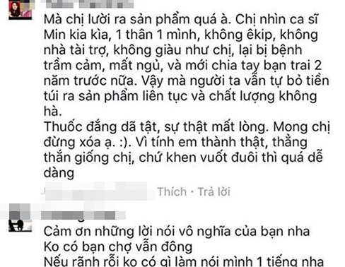 Chị sẽ chả nói chuyện với em làm gì vì em xàm lắm, nhưng do em đã bình luận quá nhiều lần kiểu xấc láo, dạy đời như vậy rồi - nghĩa là em có cả ý đồ âm mưu đằng sau, nên chị khuyên em nhé: biến“.