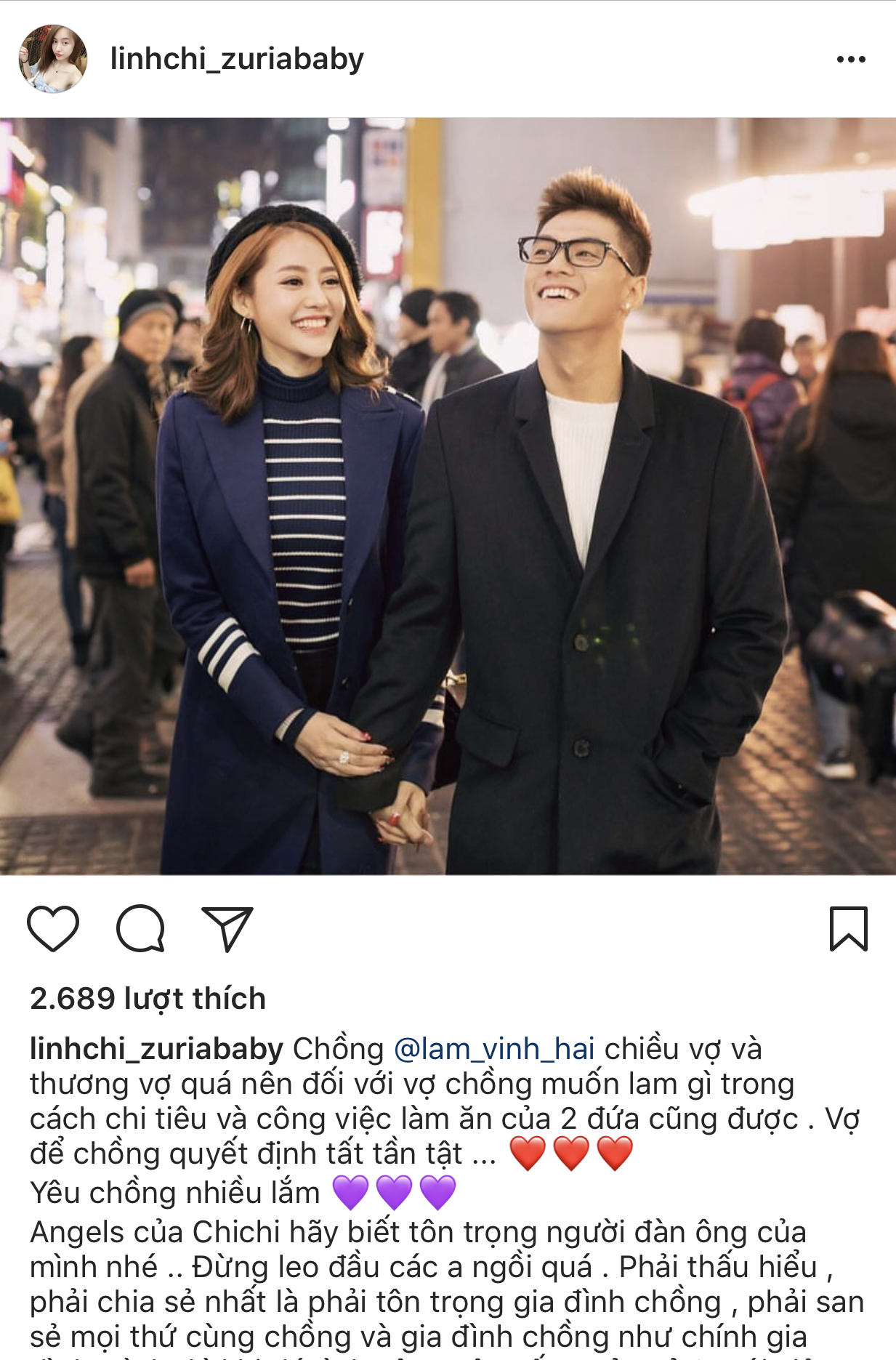 Mới đây, thông qua trang Instagram cá nhân, Linh Chi khiến fan không khỏi ganh tỵ khi thể hiện tình cảm với Lâm Vinh Hải. Người đẹp chia sẻ: “Chồng Lâm Vinh Hải chiều vợ và thương vợ quá nên đối với vợ, chồng muốn làm gì trong cách chi tiêu và công việc làm ăn của 2 đứa cũng được. Vợ để chồng quyết định tất tần tật. Yêu chồng nhiều lắm”.