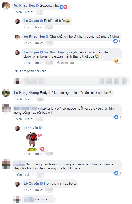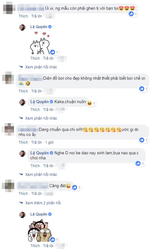 Phía dưới bình luận, không ít bạn bè, đồng nghiệp và cư dân mạng bày tỏ sự ngưỡng mộ trước thân hình quá đỗi nuột nà của Lệ Quyên. Diva Hồng Nhung còn trêu đùa giọng ca Nếu em được lựa chọn: “Body thế kia, để ngắm là mỹ mãn rồi, không cần bơi!”.