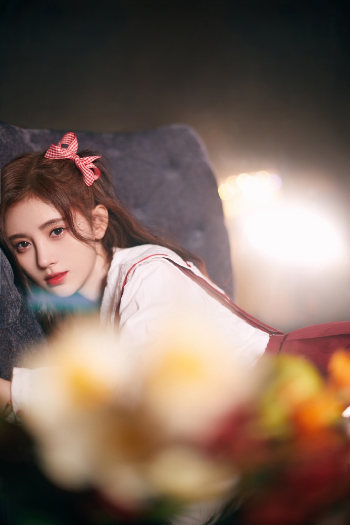 Cô nàng với bộ trang phục váy đỏ mang đậm phong cách trường học phối với áo trắng cùng với thắt nơ màu đỏ trên tóc, vừa trẻ trung lại ngọt ngào.