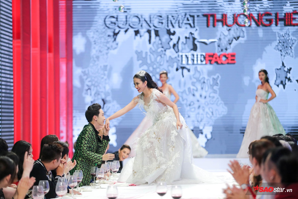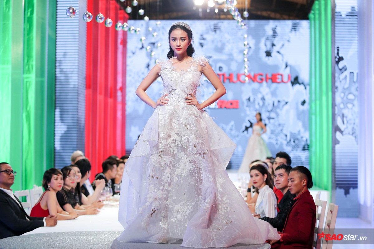 Khoác lên mình chiếc váy cưới lộng lẫy của nhãn hàng, gương mặt, nụ cười sáng đã giúp Thiên Nga xinh đẹp như một nàng công chúa. Tuy nhiên, với phần đuôi áo hơi dài và bồng bềnh đã rất khó khăn để cô lướt đi dễ dàng trên bàn tiệc. Với tiêu chí “không ngại khó” Thiên Nga sẵn sàng bước vào thử thách, ngay lập tức thần thái của cô đã gây chú ý với những khách mời.