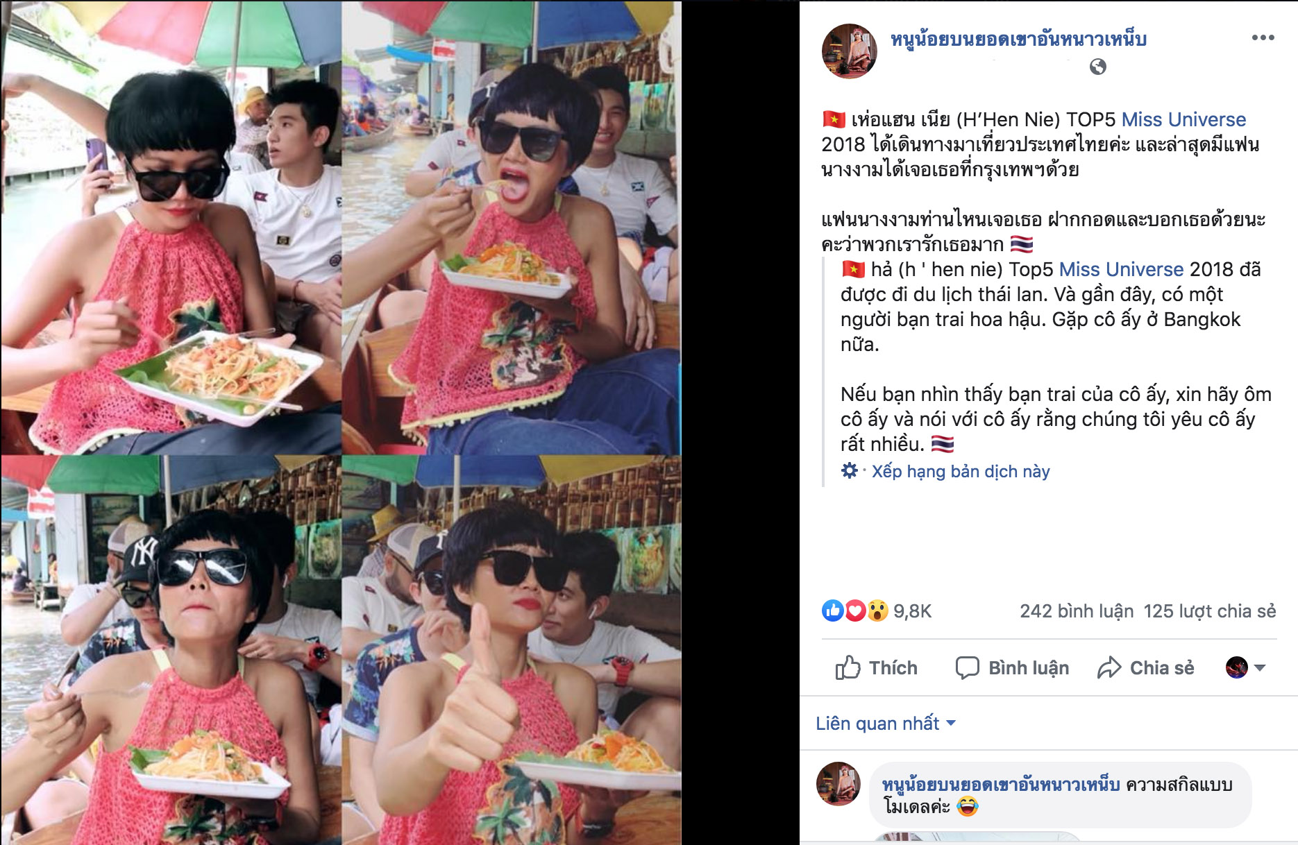 Mới đây, trong chuyến đi thăm thú và trải nghiệm lễ hội Songkran (Tết Thái), H'Hen Niê được người hâm mộ săn đón. Rất nhiều hình ảnh của hoa hậu Ê-đê được chụp lại và đăng tải trên fanpage cùng các ngôi sao Thái Lan và quốc tế.