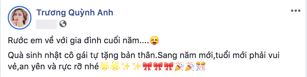 Trải qua một thời gian vời nhiều những thử thách trong sự nghiệp cho đến chuyện gia đình, nữ nghệ sĩ đã nhanh chóng “lấy lại phong độ” của mình. Mới đây, chia sẻ trên trang thông tin cá nhân, Trương Quỳnh Anh vui mừng với món quà sinh nhật mới mà nữ nghệ tự thưởng cho bản thân. Món quà là chiếc “xế hộp” tiền tỷ. Kèm theo đó là một lời chúc cho chính mình: “Quà sinh nhật cô gái tự tặng bản thân. Sang năm mới, tuổi mới phải vui vẻ, an yên và rực rỡ nhé!”.