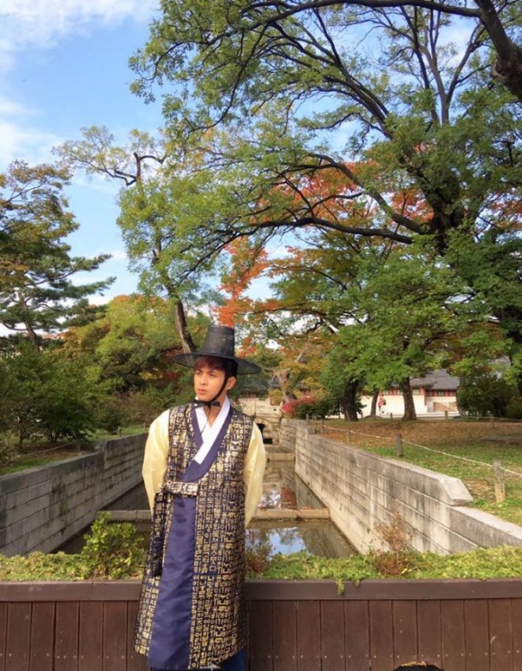 Bí mật đi du lịch với bạn gái Bảo Anh, Hồ Quang Hiếu tạo dáng “cool boy” với bộ Hanbok như chú rể giữa khung cảnh lãng mạn.