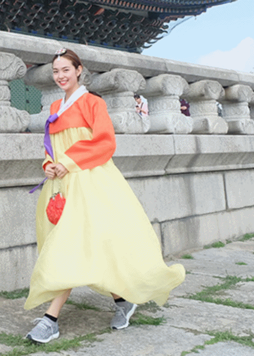 Nếu các đấng mày râu lúc nào cũng cá tính thì phái nữ lại dịu dàng, xinh đẹp. Diện trang phục truyền thống tông đỏ vàng, Chi Pu được khen xinh đẹp như một “tiểu công chúa” ở ngôi làng cổ Hanok Bukchon.