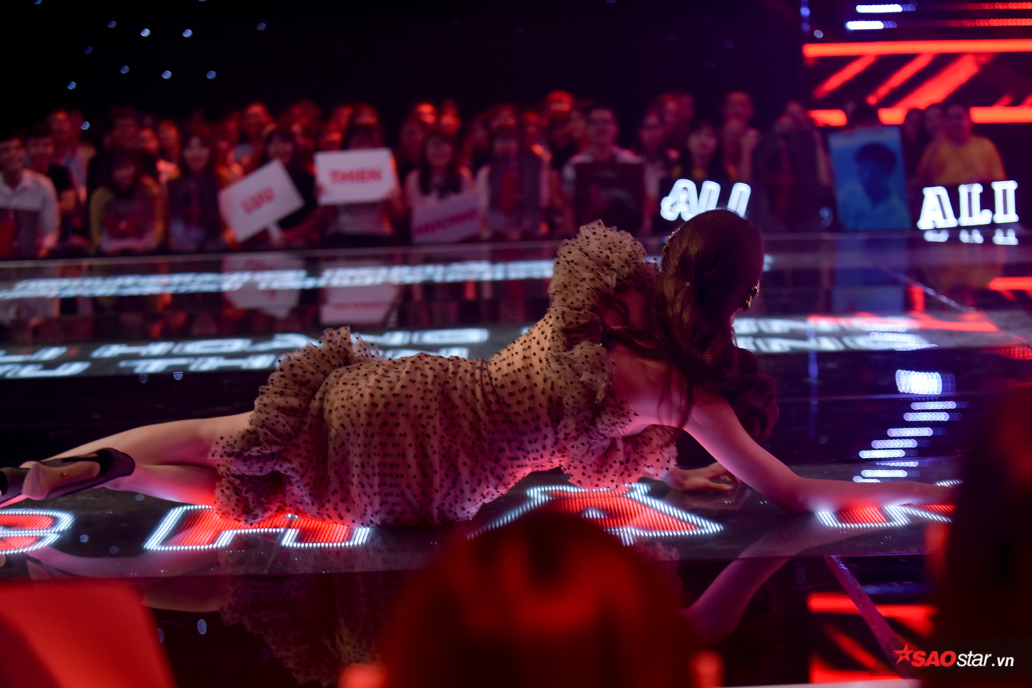 Hương Giang nằm dài trên sân khấu để chiêu dụ Thúy Nga vì bị chặn.