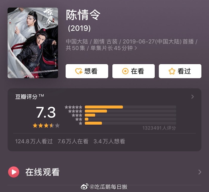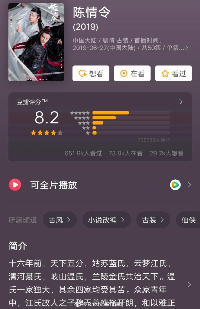 Đặc biệt, Trần tình lệnh - tác phẩm làm nên danh tiếng của Tiêu Chiến đối mặt với cơn mưa đánh giá 1 sao. Chỉ sau một đêm, lượng đánh giá của bộ phim tăng thêm 170 ngàn người, đa số chỉ toàn 1-2 sao, khiến điểm số bị giảm xuống chỉ còn 8,0 điểm. Vài ngày tiếp theo, Trần tình lệnh tiếp tục hứng chịu hàng loạt bình luận chỉ trích, mắng chửi đến từ antifan Tiêu Chiến, lượng đánh giá lên đến 1,24 triệu người. Tỉ lệ 1 sao tăng rất cao nhưng điểm số của bộ phim vẫn luôn giữ ở mức 7.9 điểm, không hề xê dịch thay đổi suốt 1 tháng qua.