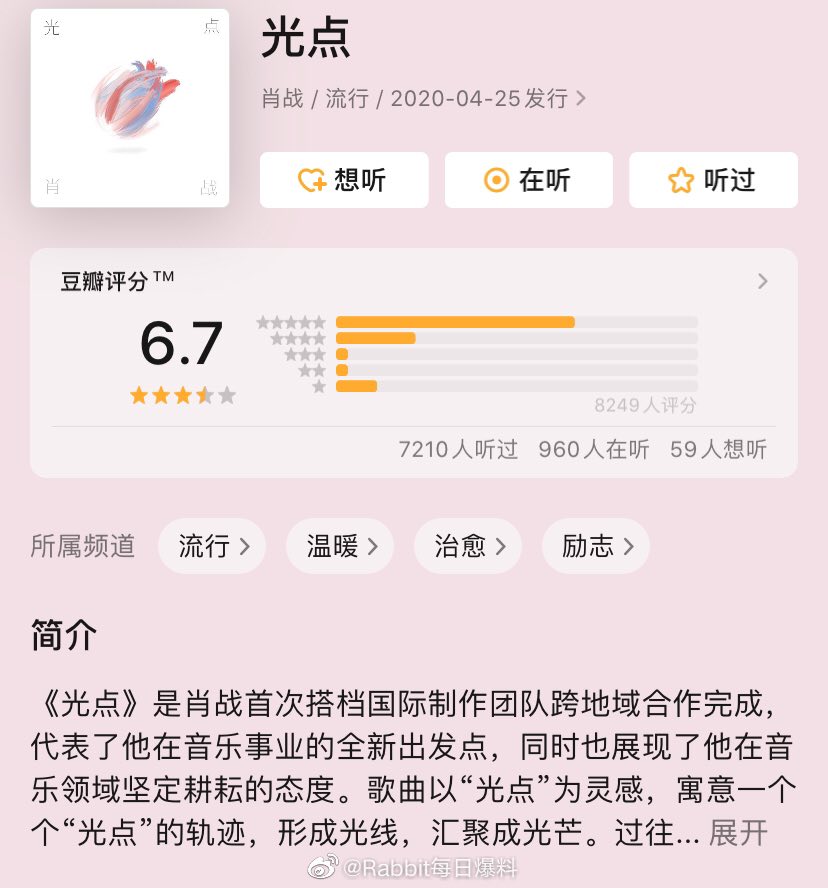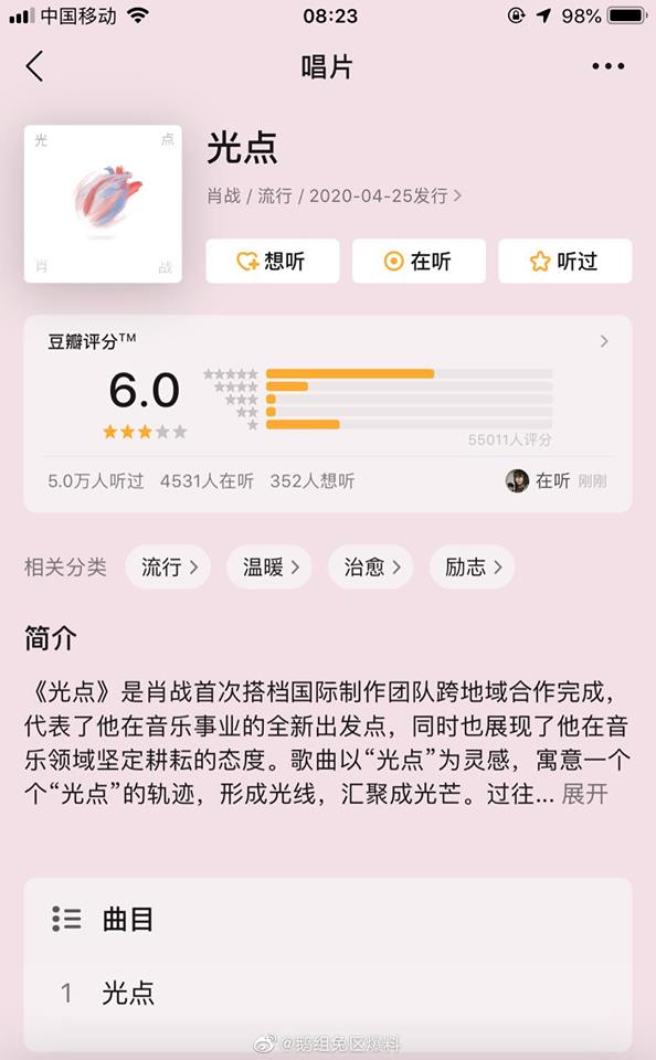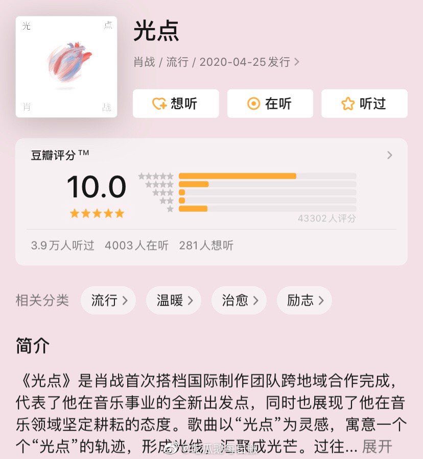 Để có được điểm số này trên Douban thì tác phẩm đó phải đạt 99%-100% lượng đánh giá 5 sao. Trong khi bài hát của Tiêu Chiến ở thời điểm 10.0 vẫn chiếm lượng khá lớn đánh giá 1 sao. Theo cách tính điểm thông thường, để Điểm sáng đạt 10.0 với tỷ lệ 1 sao nhiều như thế này là điều không thể xảy ra.