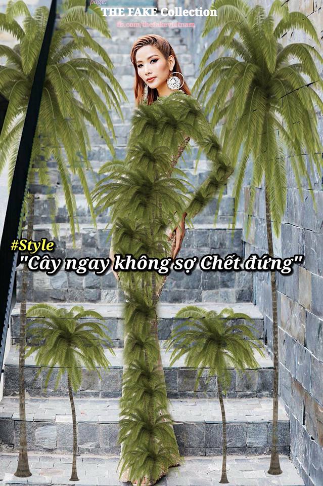 Set đồ ánh kim lộng lẫy của Hoàng Thùy đã được “chế biến” thành… chiếc váy cây dừa đúng với khí chất “Cây ngay không sợ chết đứng”.