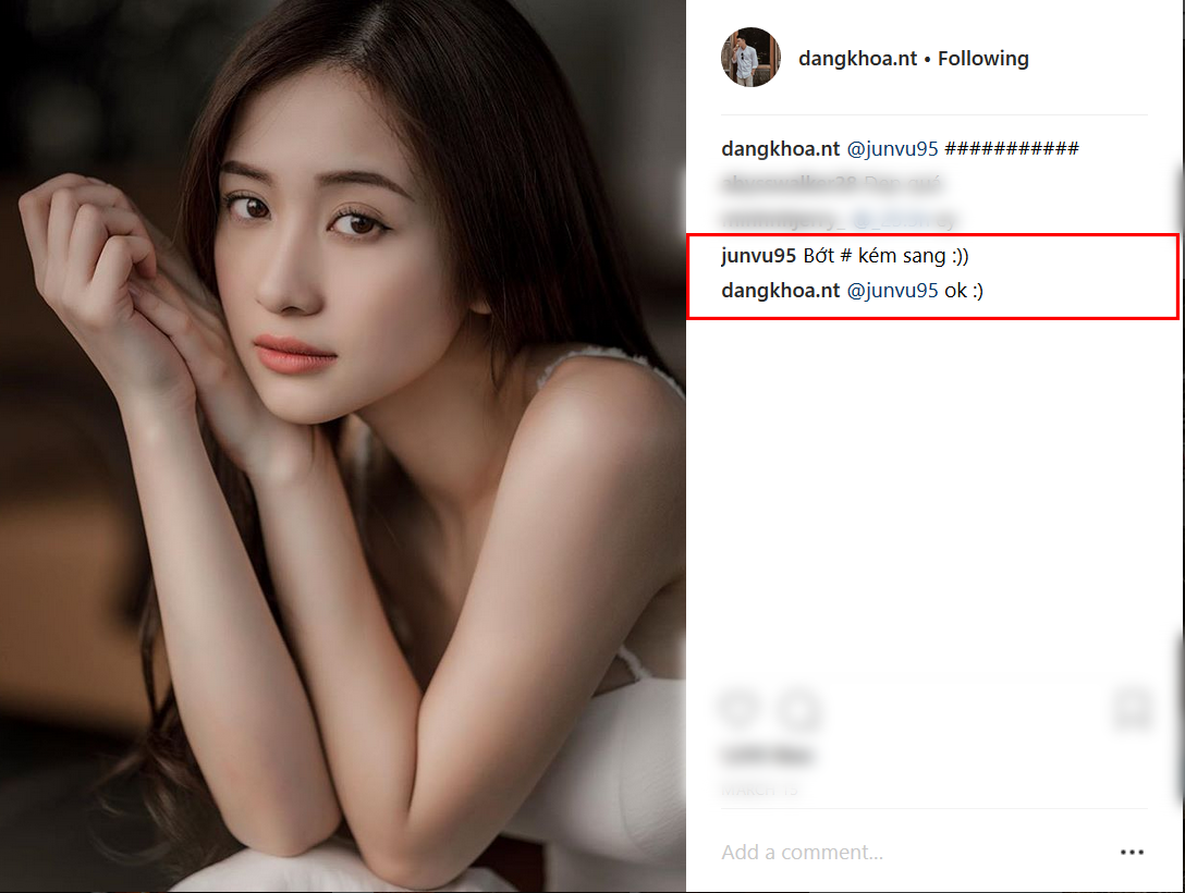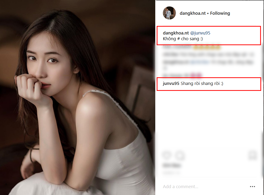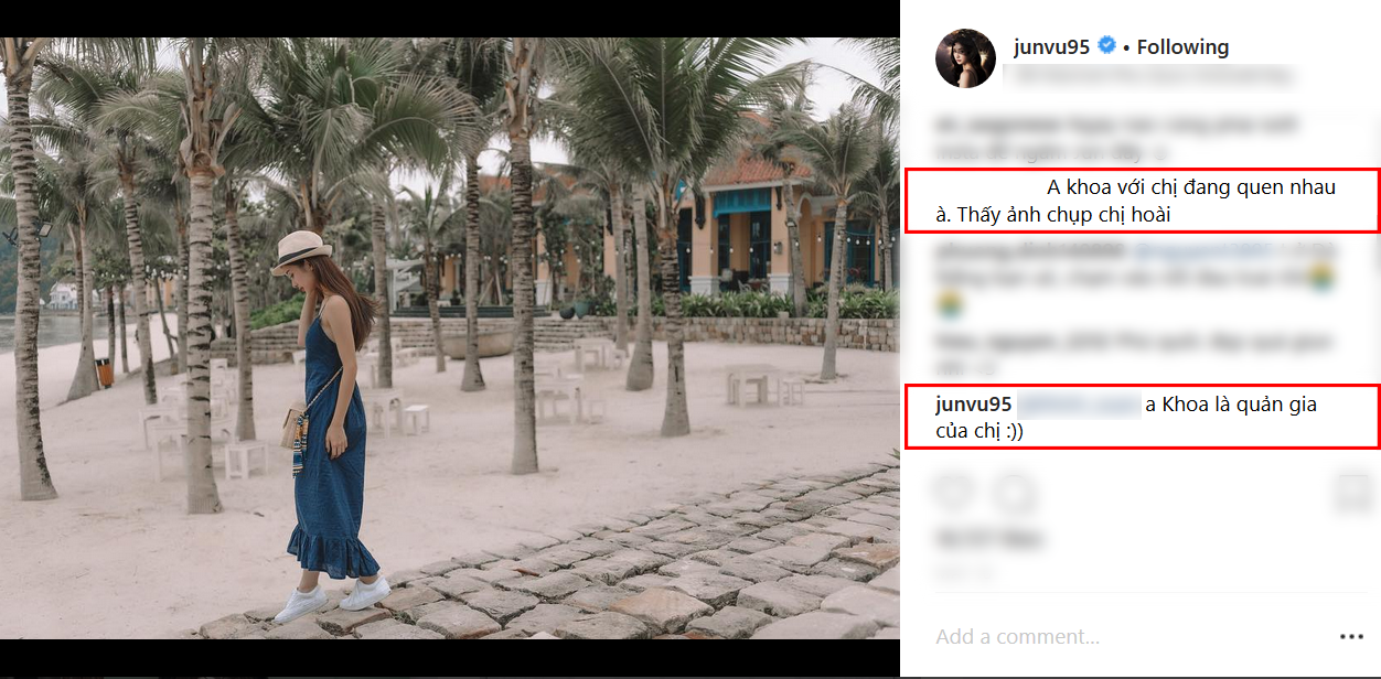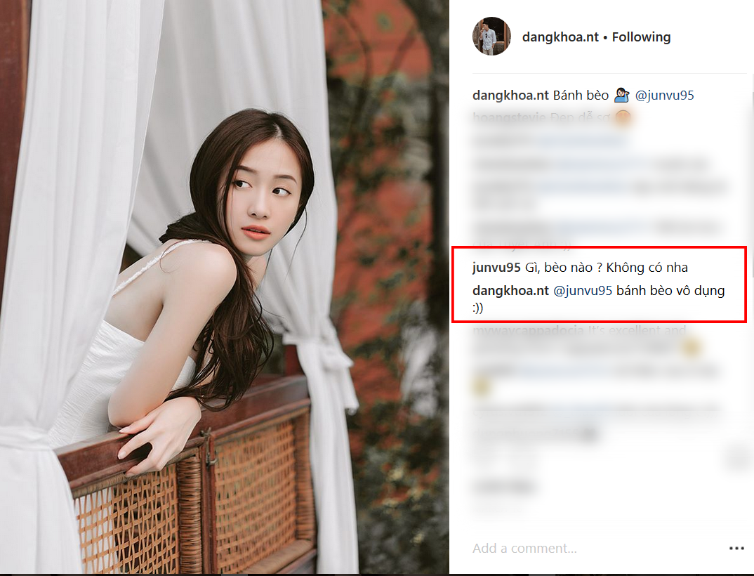 Ngay cả siêu mẫu Trần Quang Đại - Top 7 Vietnam's Next Top Model Mùa 4 - người cũng đã từng hợp tác với Photographer Đăng Khoa - cũng từng comment “chọc ghẹo” cả hai khi nam photographer đăng một bức ảnh khá giống Jun Vũ lên trang cá nhân. Vậy thực hư câu chuyện thế nào ? Có phải nam siêu mẫu cũng biết rằng Jun Vũ và Đăng Khoa đang yêu nhau nên mới bình luận như thế ngay trên mạng xã hội.