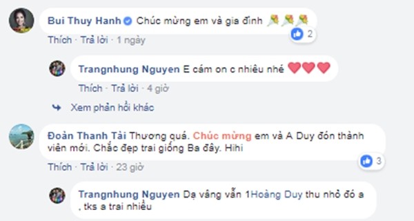 Hiện Trang Nhung cùng con trai còn nằm viện thêm vài ngày để bác sĩ theo dõi sức khỏe. Đặt tên ở nhà cho con là bé Gấu nhưng vợ chồng cô vẫn đang suy nghĩ để lựa chọn cái tên khai sinh thật ưng ý. Người đẹp gốc Bắc Ninh sẽ về nhà chuẩn bị đón Tết khi sức khỏe ổn định.