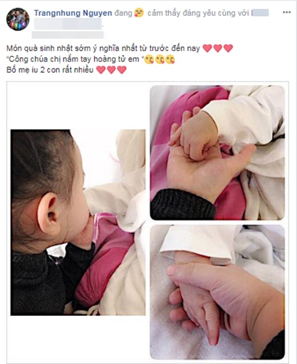 Vừa qua, trang cá nhân của người mẫu/diễn viên Trang Nhung đăng tải hình ảnh con gái đầu lòng nắm tay cậu em trai mới chào đời cùng dòng chia sẻ: “Món quà sinh nhật sớm ý nghĩa nhất từ trước đến nay. Công chúa chị nắm tay hoàng tử em. Bố mẹ iu 2 con rất nhiều”. Theo đó, nữ chính của Scandal 2: Hào quang trở lại hạ sinh quý tử nặng 3,9 kg tại Hà Nội vào trưa ngày 2/2.