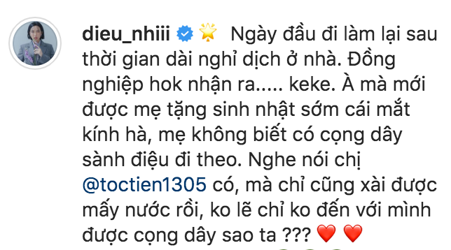 Tuy được mọi người khen ngợi với hình ảnh sang chảnh mới đây, Diệu Nhi vẫn khiến cư dân mạng “cười ngất” khi công khai nhắn nhủ Tóc Tiên để xin xỏ chiếc dây đeo sành điệu mà đàn chị đang sở hữu. Nữ diễn viên “bẻ lái” khéo léo: “Ngày đầu đi làm lại sau thời gian dài nghỉ dịch ở nhà. Đồng nghiệp hok nhận ra….. keke. À mà mới được mẹ tặng sinh nhật sớm cái mắt kính hà, mẹ không biết có cọng dây sành điệu đi theo. Nghe nói chị @toctien1305 có, mà chỉ cũng xài được mấy nước rồi, không lẽ chỉ không đến với mình được cọng dây sao ta???“. Đáp lại yêu cầu tha thiết của Diệu Nhi, giọng hát Ngày tận thế đáp sẽ bán rẻ với giá 800 nghìn.