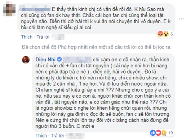 Luôn là “cây hài” bất chấp trên sân khấu hay ngoài đời thực, Diệu Nhi được mọi người yêu mến vì nguồn năng lượng tích cực mà nữ diễn viên mang lại. Tuy nhiên cũng ngay trong phần đăng tải hài hước đó bất ngờ xuất hiện một bình luận công kích cô và xúc phạm đến các fan của Diệu Nhi. Ngay lập tức, nữ diễn viên đã có động thái đáp trả vì cư dân mạng này dùng lời lẽ không hay với người hâm mộ của mình.
