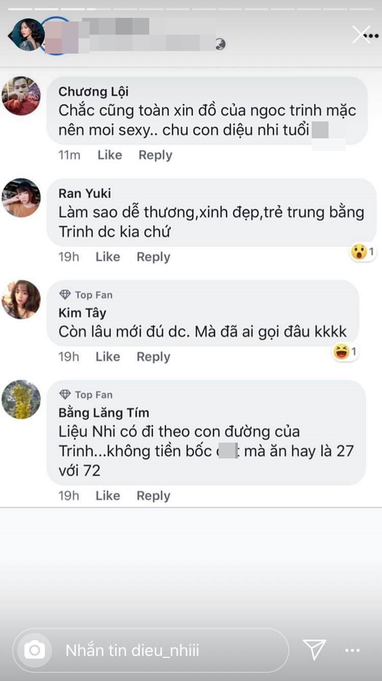 Mới đây, những hình ảnh được Diệu Nhi đăng tải trên story facebook của mình khiến cộng đồng mạng chú ý. Cụ thể hơn, cô nàng đã có lời lẽ khá mạnh mẽ, cứng rắn để đáp trả loạt bình luận khiếm nhã, xúc phạm của antifan, đồng thời so sánh cô với đàn chị Ngọc Trinh.