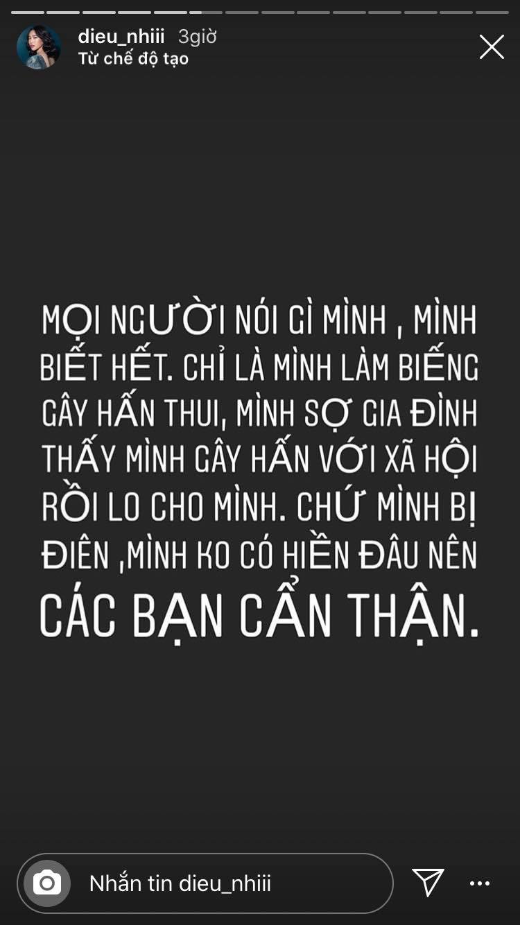 Cẩn thận chụp lại những lời nhận xét này của cư dân mạng, Diệu Nhi đăng tải chúng lên story kèm lời nhắn:“Mọi người nói gì mình, mình biết hết. Chỉ là mình làm biếng gây hấn thui, mình sợ gia đình thấy mình gây hấn với xã hội rồi lo cho mình. Chứ mình bị điên, mình không có hiền đâu nên các bạn cẩn thận”.
