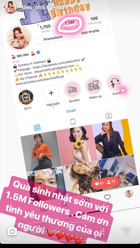 Trên stories của mình, Diệu Nhi vui vẻ báo cho người hâm mộ khoảnh khắc Instagram đạt mốc 1,5 triệu followers. Có vẻ như đây là món quà sinh nhật “khủng” và cực kỳ có ý nghĩa đối với nữ diễn viên Chiến dịch chống ế. Điều này chứng tỏ tình cảm và sự quan tâm mà khán giả dành cho Diệu Nhi và cũng là thành quả xứng đáng cho những nỗ lực miệt mài trong suốt những năm qua của cô.