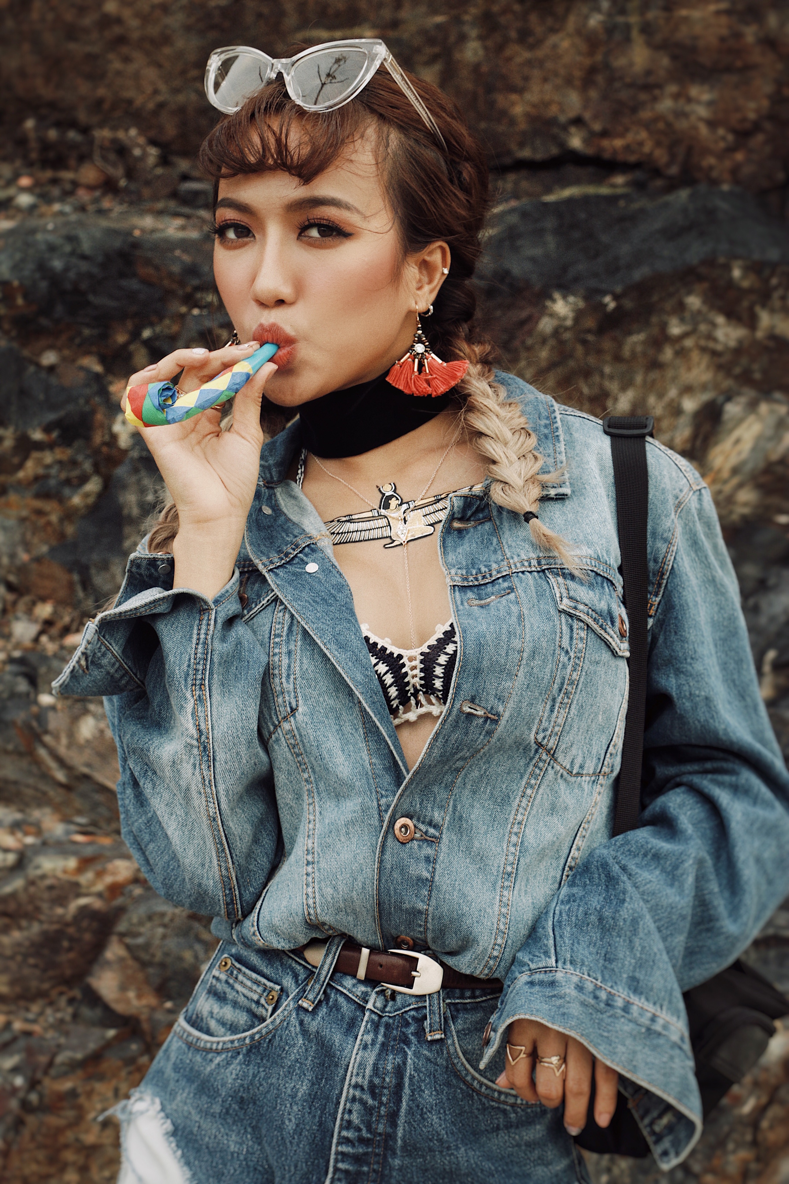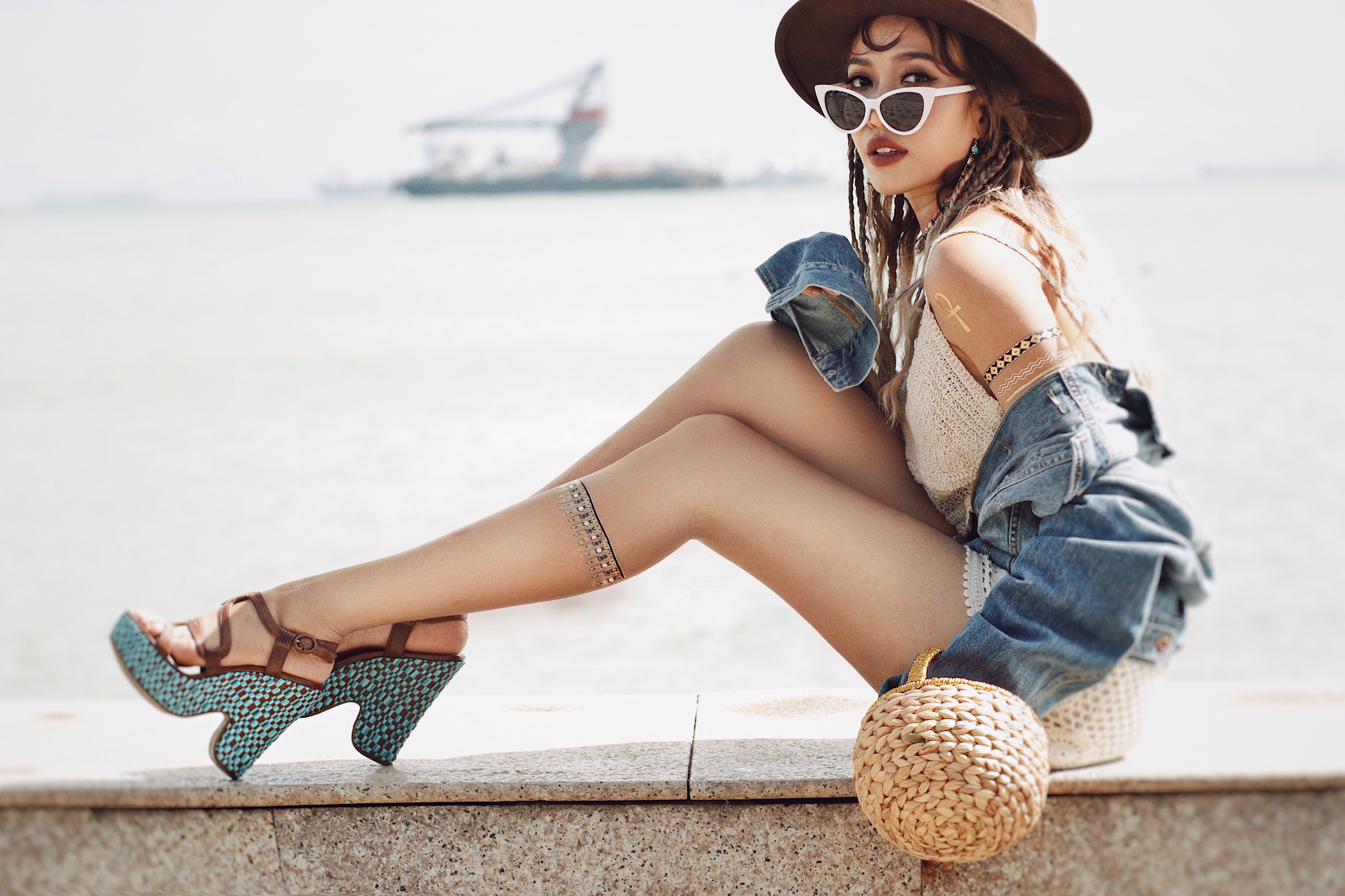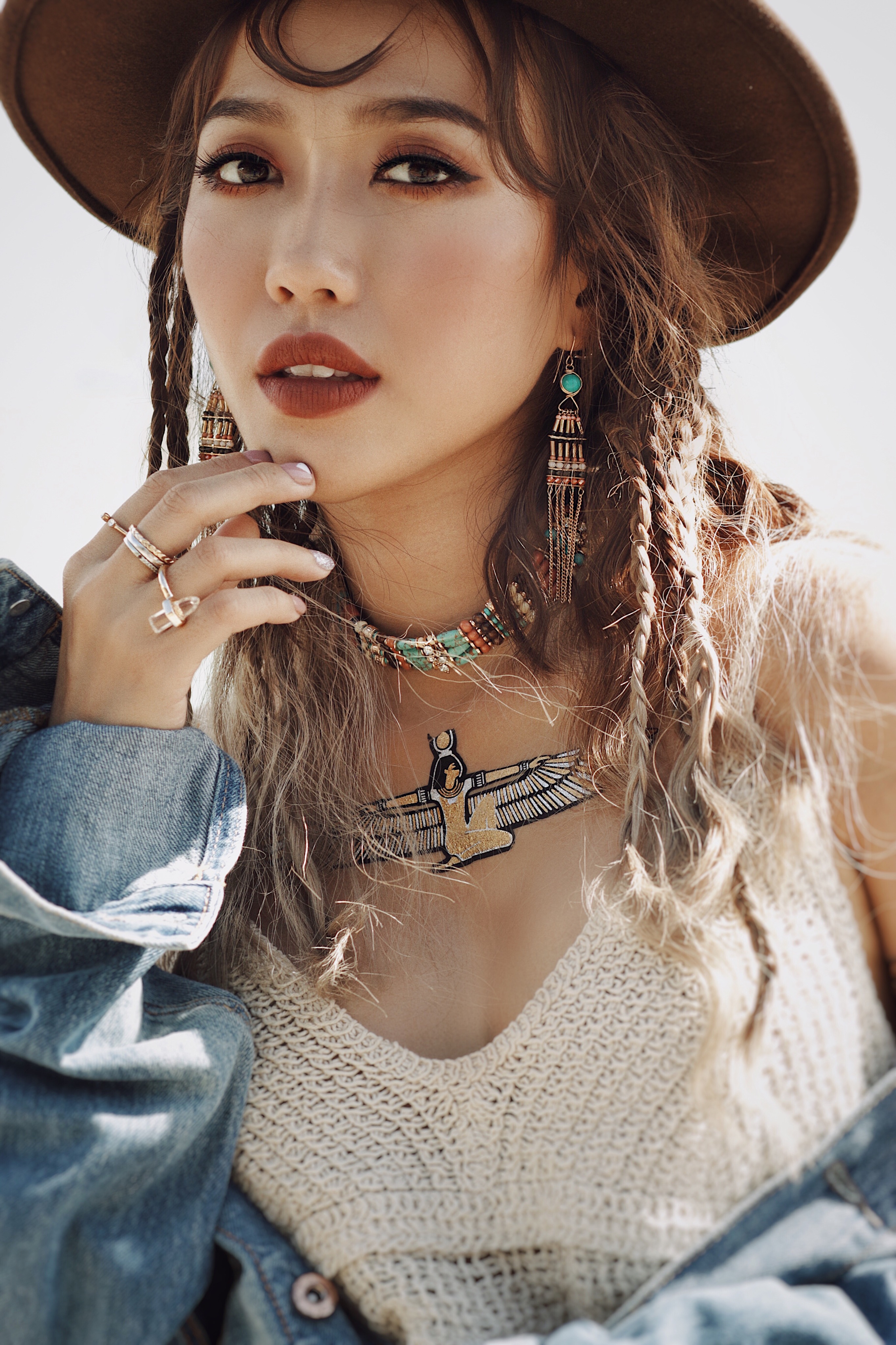 Trong loạt ảnh này, Diệu Nhi mạnh dạn bổ sung những trang phục nằm ngoài phong cách Boho quen thuộc như áo khoác denim, túi mây đan. Chính sự kết hợp độc đáo này tạo nên dấu ấn riêng biệt cho nữ diễn viên.
