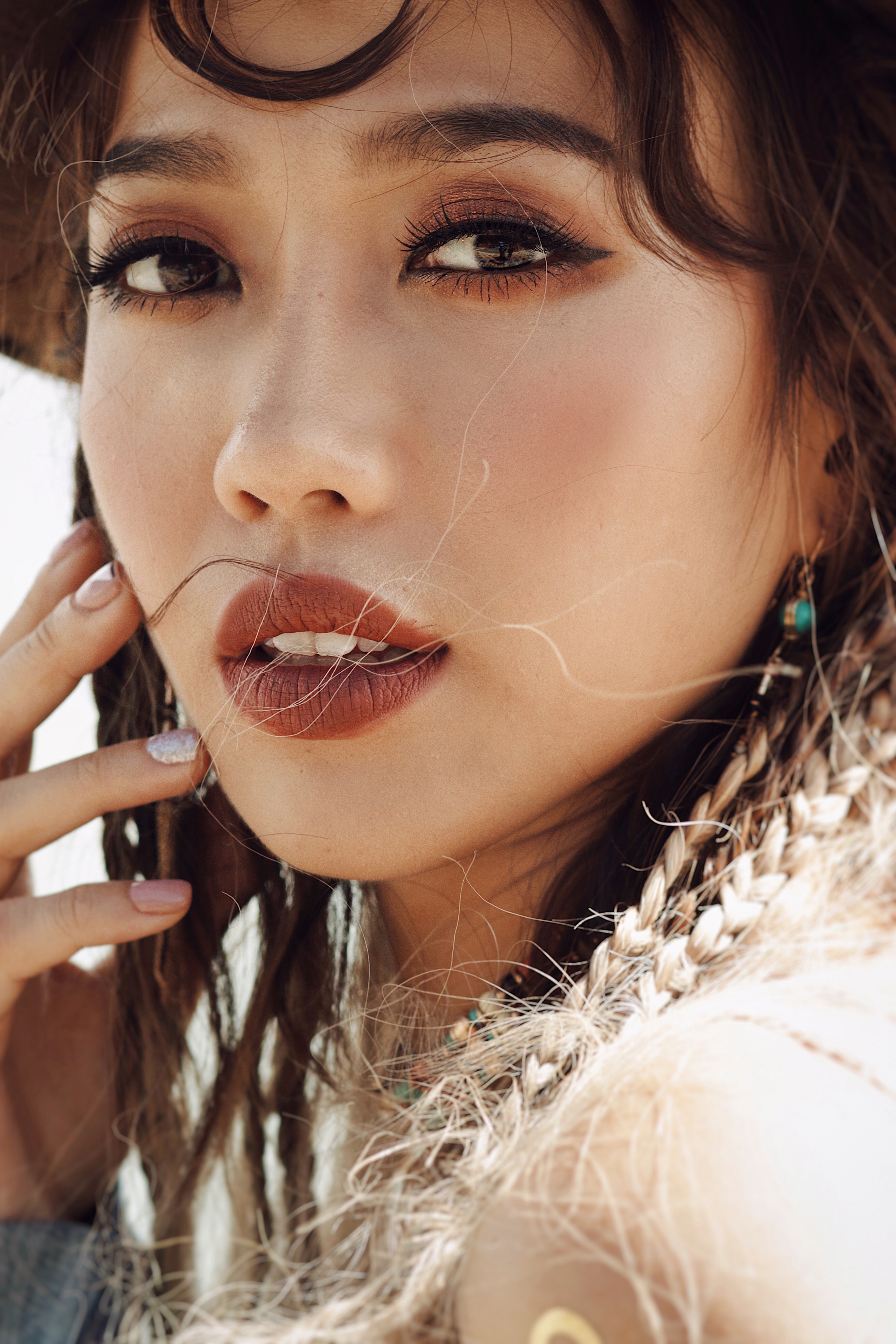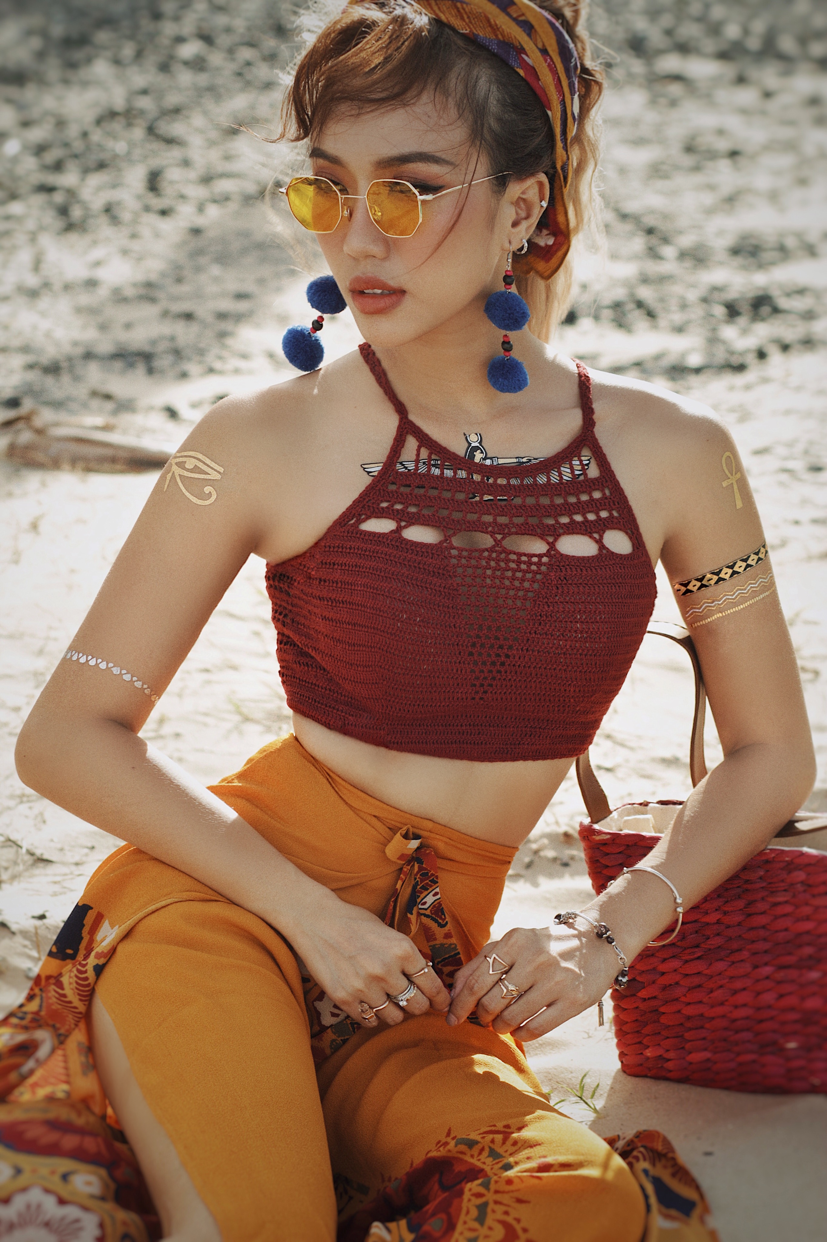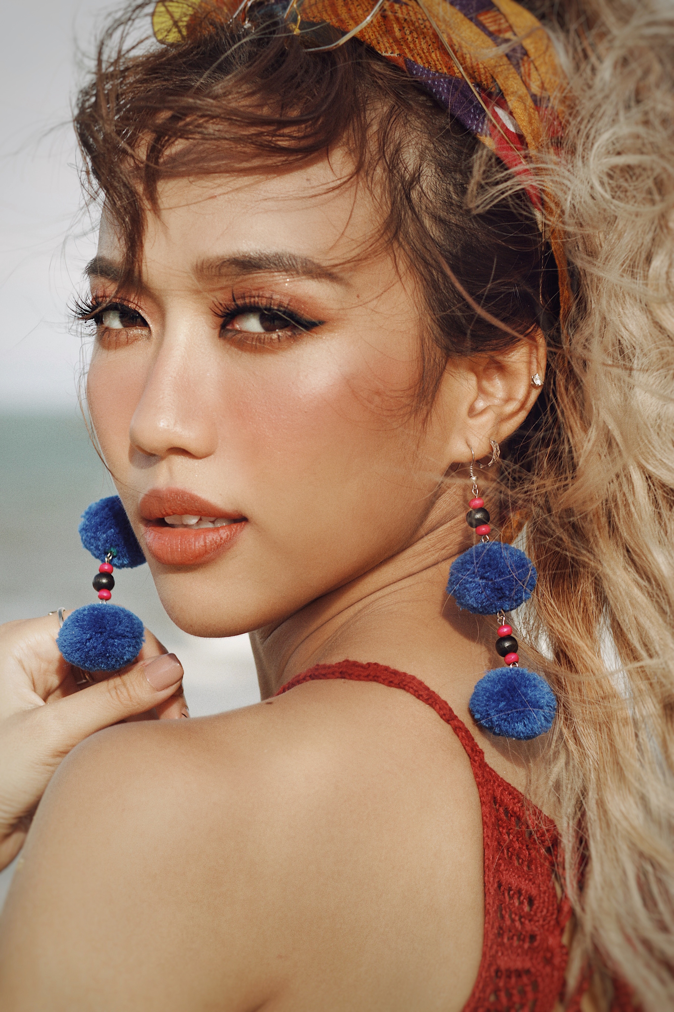 Về kiểu tóc, nữ diễn viên chọn kiểu tóc búi thắt và đánh xù năng động hiện đại. Lối trang điểm tông cam hay nude là một điểm cộng để Diệu Nhi hóa thân thành cô nàng boho-chic đúng chất.