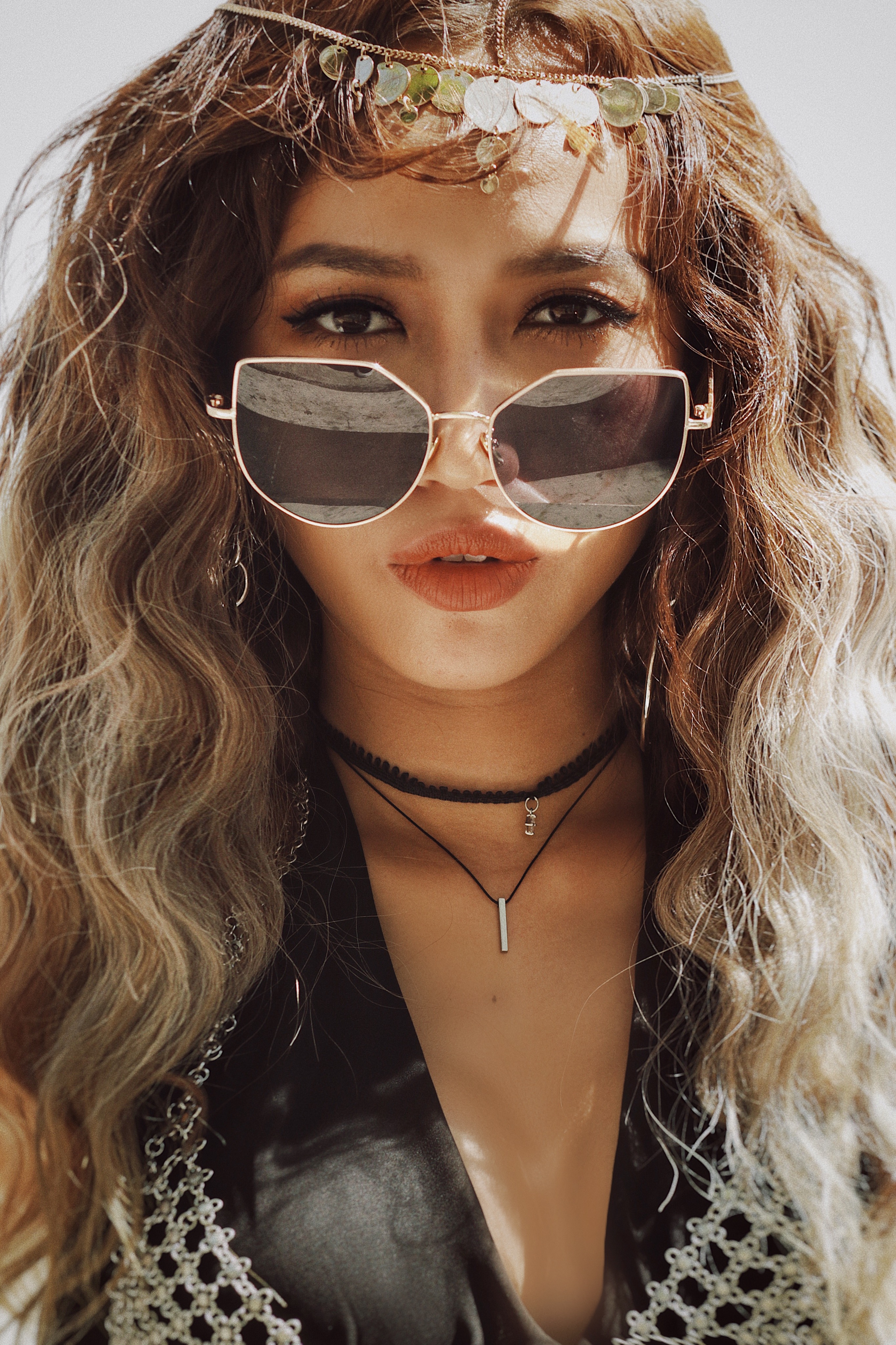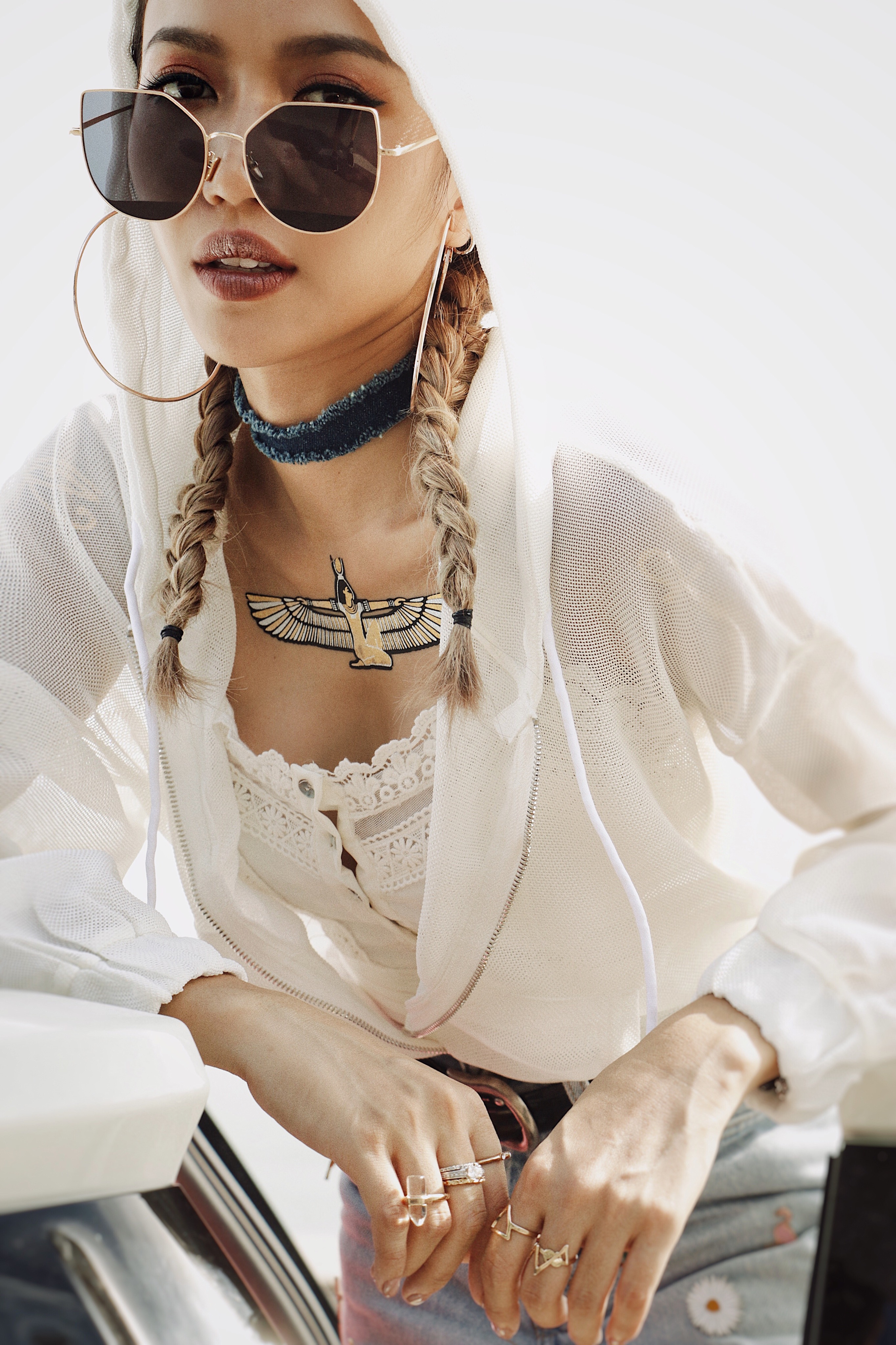 Cô không quên lựa chọn phụ kiện như gọng kính mắt mèo, kính tròng màu, nón rộng vành, khăn turban nhằm hoàn thiện tổng thể nổi loạn.