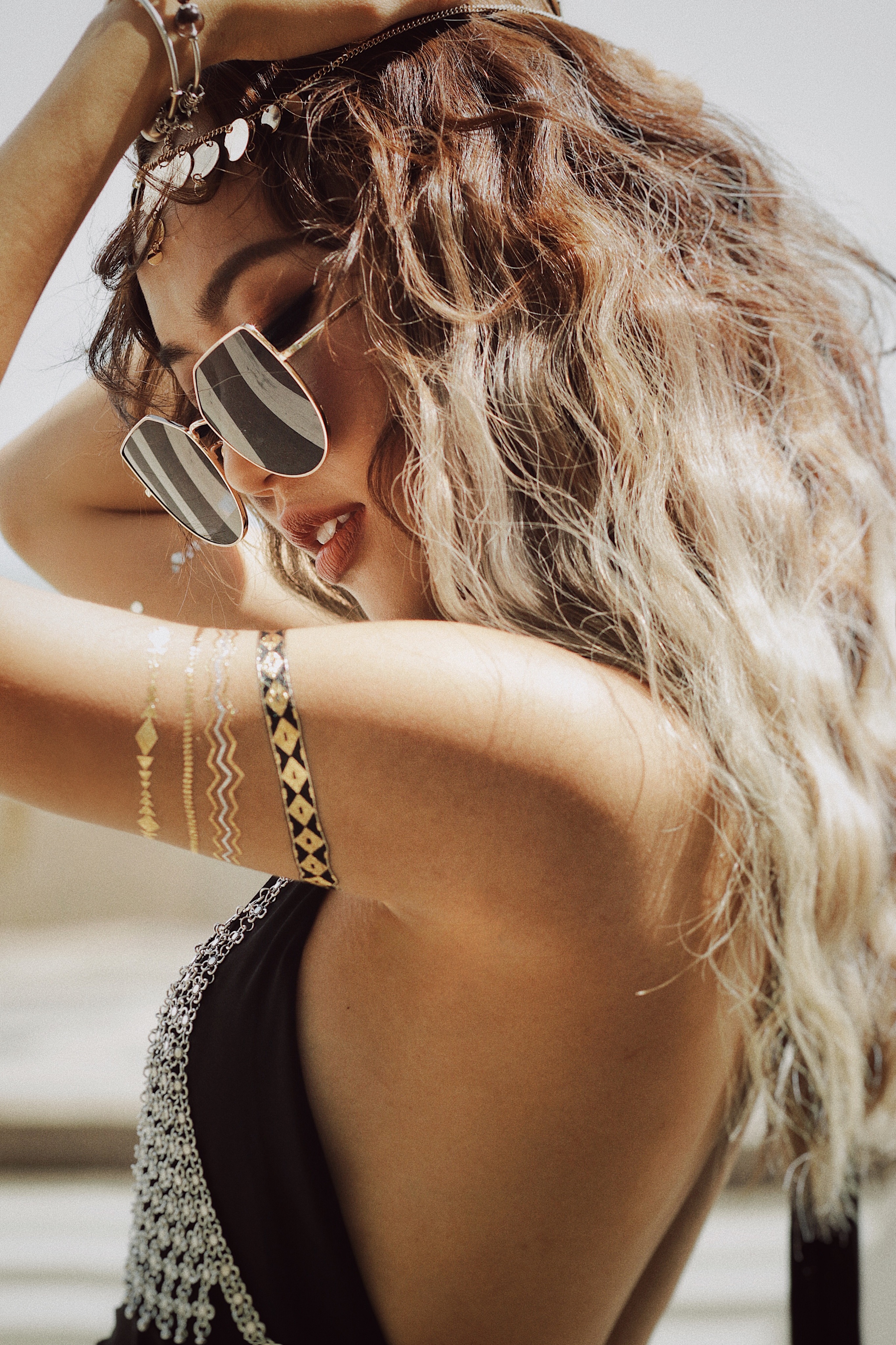 Thêm vào đó, Diệu Nhi còn biến hóa diện mạo bằng những hình xăm mạ vàng đồng độc đáo.