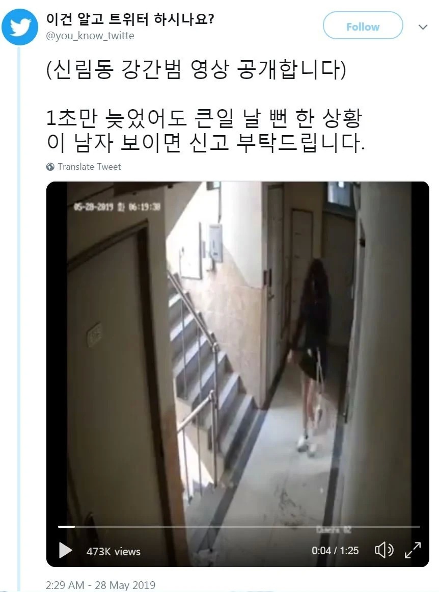 Đoạn footage dài 1 phút trích xuất từ một camera an ninh (CCTV), có tựa đề “Sinlim-dong Rape Attempt” đang lan truyền trên Twitter với nội dung khiến người xem phải rùng mình khiếp sợ. Đoạn video này làm dấy lên làn sóng phẫn nộ tại Hàn Quốc, đến mức người dân đã làm bản kiến nghị yêu cầu cơ quan điều tra phải xử phạt thật nặng gã đàn ông xuất hiện trong đó, vụ việc hiện đang được cảnh sát điều tra.