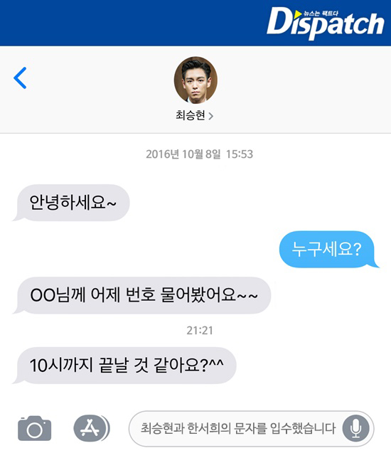 Dispatch tiếp tục nói rằng, quay trở lại vào ngày 08/10/2016, Han Seo Hee lần đầu bắt đầu mối quan hệ với TOP. Vào ngày này, cô đã nhận được một tin nhắn từ số điện thoại lạ: