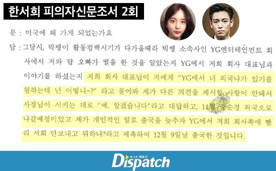Vào sáng ngày 20/06, Dispatch tiếp tục khiến YG Entertainment lao đao khi phát hành độc quyền thông tin chia sẻ về việc cực thực tập sinh Han Seo Hee. Họ nói rằng, YG đã ép buộc, đưa cô ấy sang Mỹ khoảng ba tháng vào khoảng tháng 12/2016 để chôn vùi vụ việc ma túy có liên quan đến TOP (Bigbang).