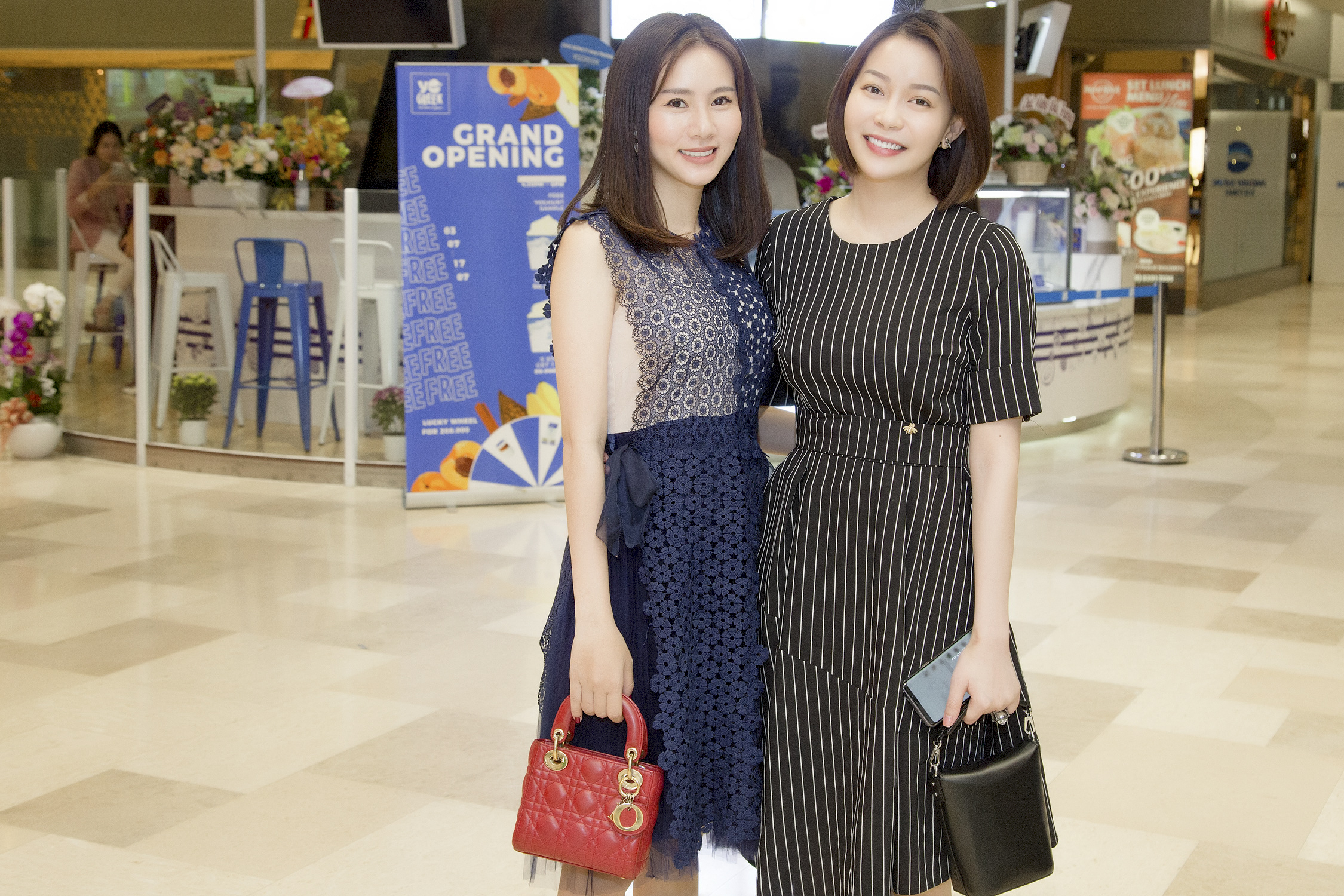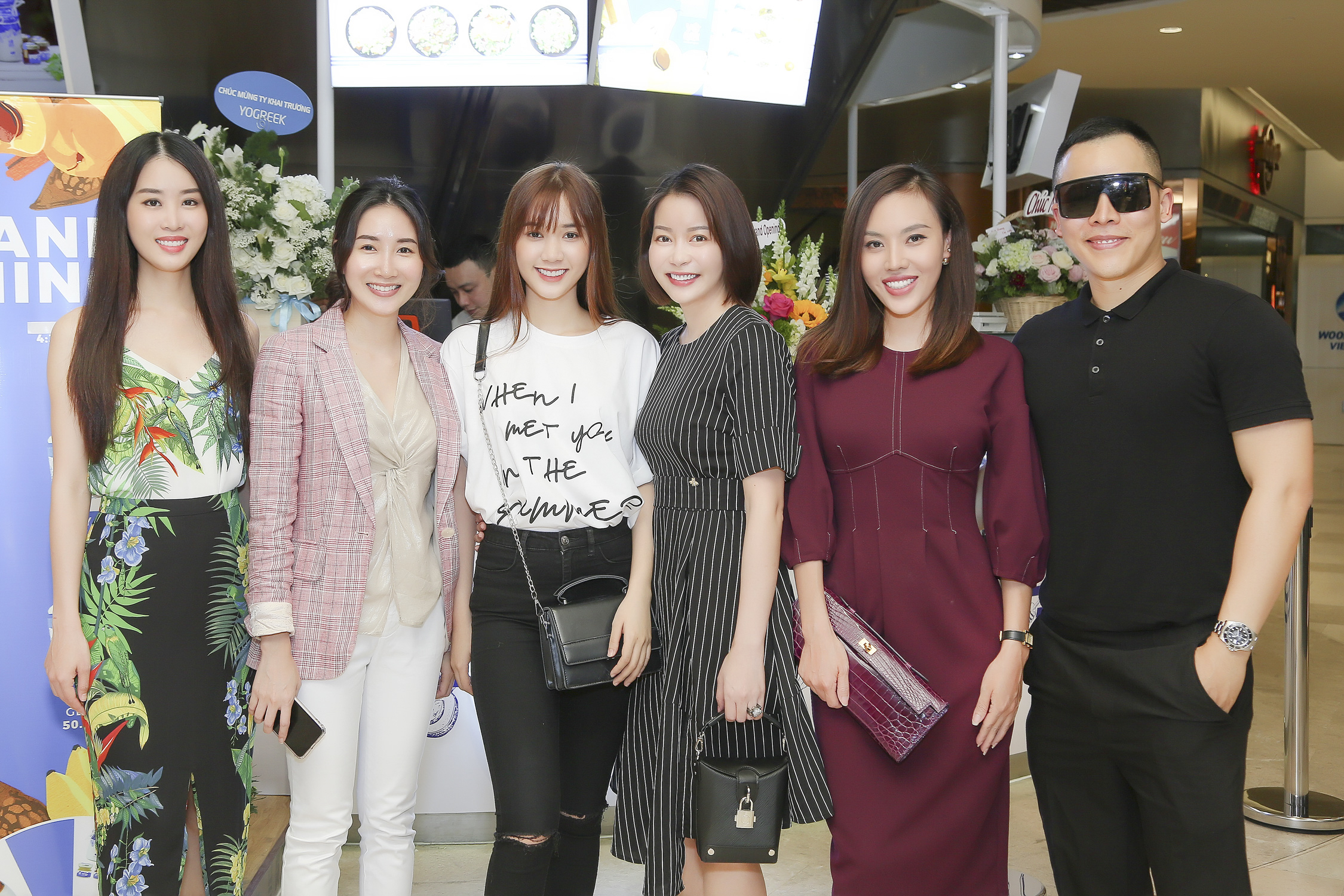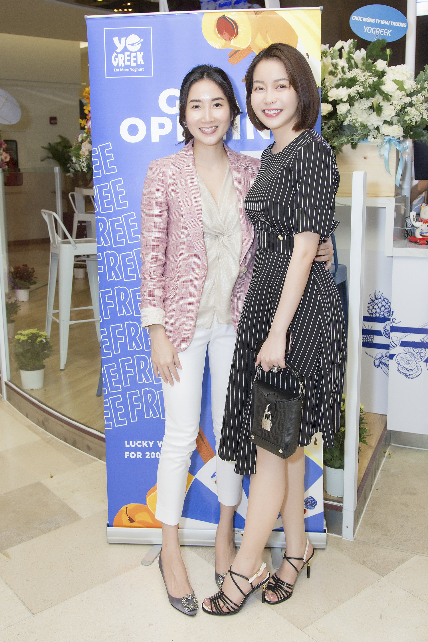 Chiều 3/7, hoa hậu - doanh nhân Nguyễn Trần Hải Dương tranh thủ thời gian đến chúc mừng một người bạn nhân dịp cô này khai trương cửa hàng kinh doanh sữa chua mang tên YoGreek tại TP.HCM. Bà chủ HD Korea Clinic nổi bật khi diện bộ cánh màu đen kẻ sọc, kết hợp ăn ý cùng phụ kiện ton-sur-ton.