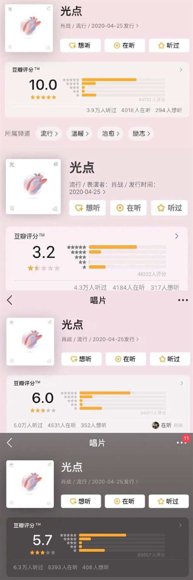 Dù thành tích về doanh thu vô cùng tốt thế nhưng Tiêu Chiến lại gặp rắc rối về mặt đánh giá trên trang Douban. Điểm số bài hát trên trang này thay đổi từ 6.7 lên 10.0 sau đó lại xuống 6.0 và đang dừng ở điểm 5.7. Phía antifan cáo buộc phía Tiêu Chiến giở trò, thao túng trang Douban.