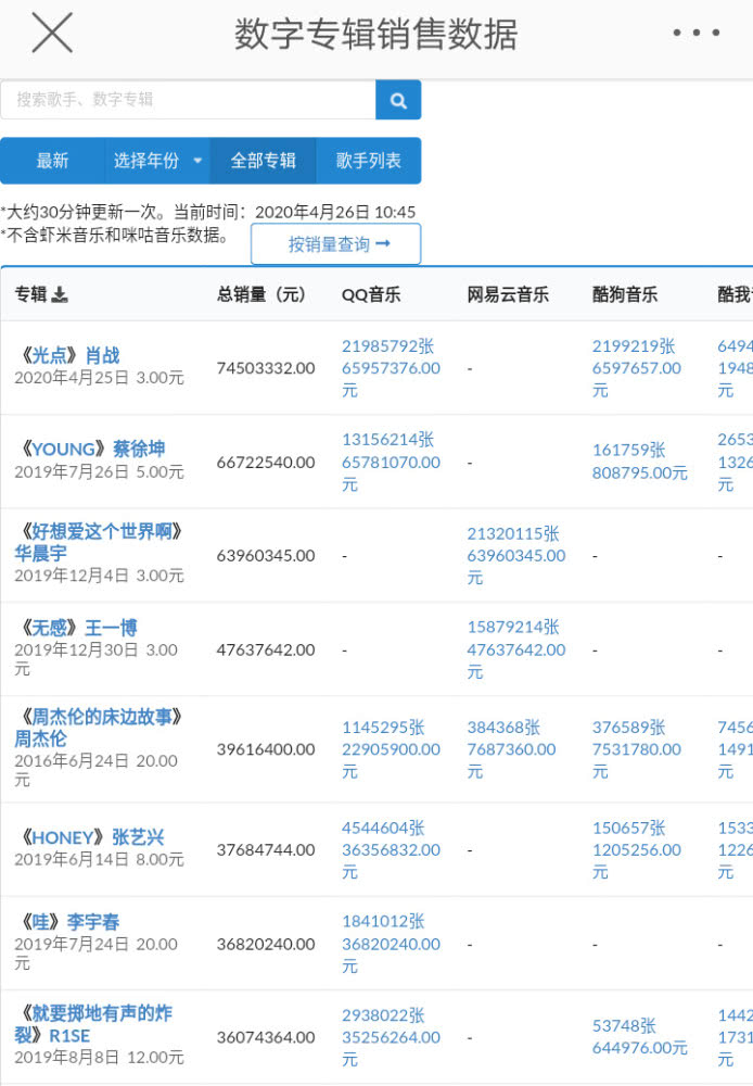 Hiện tại, doanh số bài hát Điểm sáng đã đạt đến 74,5 triệu NDT (251 tỷ đồng) trên các nền tảng âm nhạc lớn. Trên thực tế, chưa đầy 11 giờ sau khi bài hát được phát hành, doanh số tích lũy trên ba nền tảng của QQ Music, Kugou và Kuwo Music đã vượt quá 13,75 triệu bản, với doanh thu vượt 40 triệu NDT. Những kết quả như vậy thậm chí gấp đôi thành tích của bài hát Đã nói sẽ không khóc của Châu Kiệt Luân với 6 triệu bản trong 11 giờ.