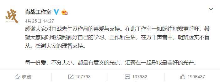 Bên cạnh đó, không ít bài viết trên Weibo cho rằng fandom Tiêu Chiến ép những thành viên fan nhỏ tuổi còn đang đi học bỏ ra số tiền lớn để mua nhạc ủng hộ thần tượng. Trước những nghi vấn này, phòng làm việc của Tiêu Chiến lên tiếng cảm ơn mọi người đã ủng hộ nam diễn viên. Đồng thời, phía anh chàng khuyên fan hâm mộ nên theo đuổi thần tượng một cách lý trí, ưu tiên việc học, công việc, cuộc sống rồi cuối cùng mới tính đến chuyện ủng hộ Tiêu Chiến.