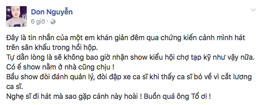 “Tự dằn lòng là sẽ không bao giờ nhận show kiểu hội chợ tạp kỹ như vậy nữa. Có ế show nằm ở nhà cũng chịu! Bầu show đòi đánh quản lý, đòi đập xe ca sĩ khi thấy ca sĩ bỏ về vì cắt lương ca sĩ. Nghệ sĩ đi hát mà sao gặp cảnh này hoài! Buồn quá ông Tổ ơi!” - Don Nguyễn cho biết.