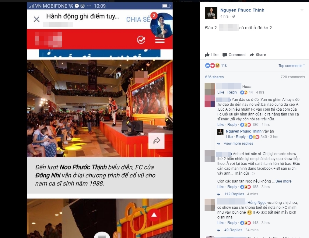 Bức hình Noo Phước Thịnh chia sẻ ghi lại khoảnh khắc anh đang trình diễn trên sân khấu cùng dòng chú thích: “Đến lượt Noo Phước Thịnh biểu diễn, FC của Đông Nhi vẫn ở lại chương trình cổ vũ cho nam ca sĩ sinh năm 1988“. Anh không quên bày tỏ thắc mắc: “Đâu? … có mặt ở đó không?”.