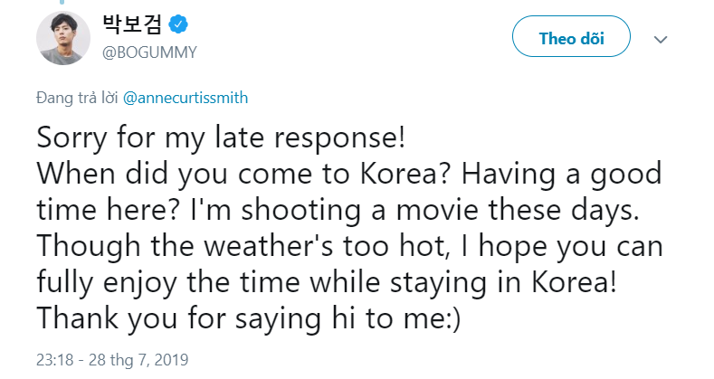 Vào ngày 28/07 (theo giờ Hàn Quốc), nữ diễn viên Anne Curtis đã đăng tải một bức ảnh selfie của mình trước tấm ảnh quảng cáo của Park Bo Gum ở Seoul thông qua tài khoản chính chủ trên mạng xã hội Twitter. Mỹ nhân 34 tuổi đã gắn thẻ tài khoản Twitter của Park Bo Gum kèm theo chú thích: “Hãy nhìn người mà tôi gặp ở Seoul nè! Annyeong (xin chào)”.
