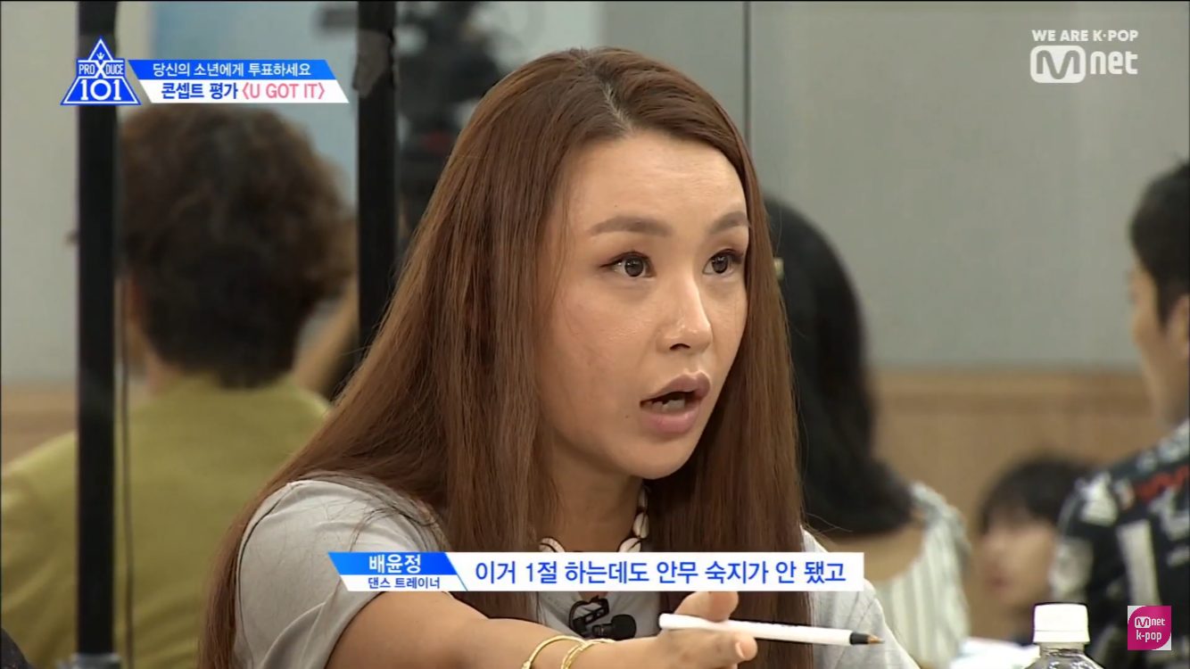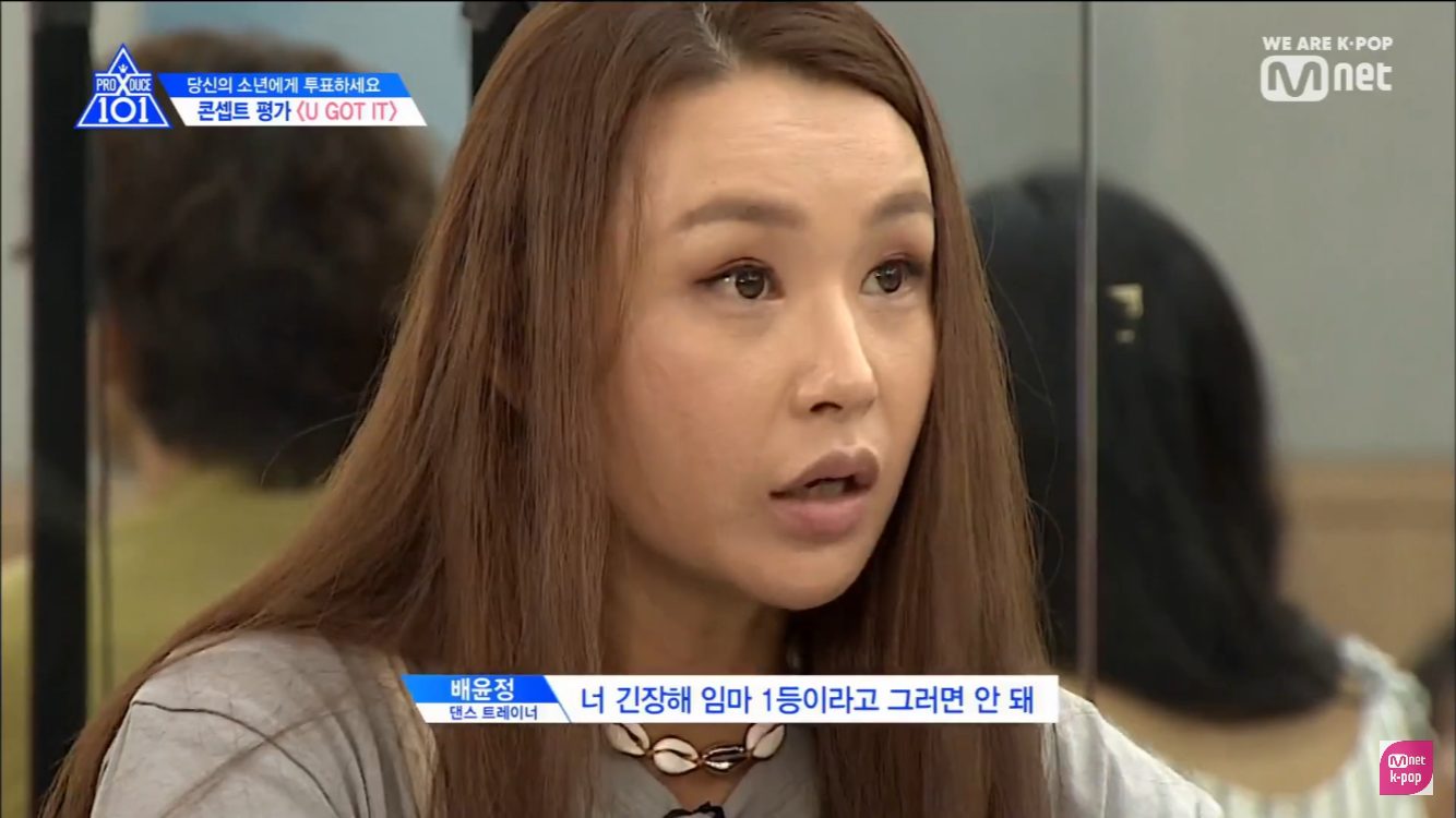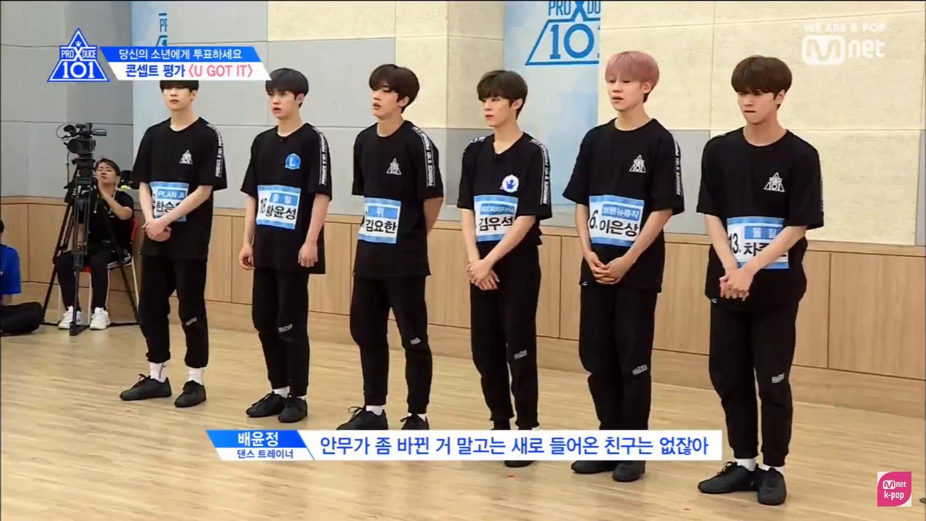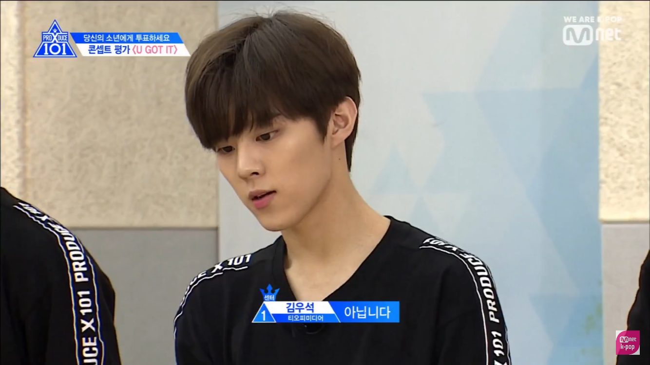 Em phải lo lắng vì em không thể làm như vậy khi đang ở hạng nhất được. Có phải bởi vì em tin về thứ hạng của mình được giữ vững?”. Kim Woo Seok trả lời: “Không ạ”. Huấn luyện viên tiếp tục: “Chị không hiểu các động tác vũ đạo của em đang thực hiện là gì luôn”.