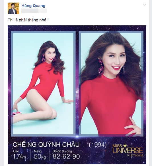 Mới đây, khi biết tin Quỳnh Châu thi Hoa hậu Hoàn vũ Việt Nam 2017, bạn trai cũ - Quang Hùng bất ngờ chia sẻ bức ảnh cô lên Facebook cá nhân. Đồng thời, Quang Hùng không quên động viên bạn gái cũ: “Thi là phải thắng nhé!“.