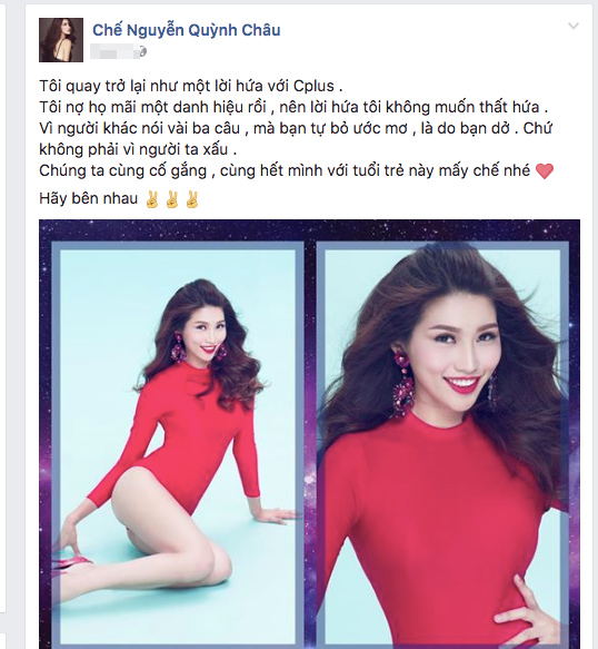 “Tôi quay trở lại như một lời hứa với Cplus. Tôi nợ họ mãi một danh hiệu rồi, nên lời hứa tôi không muốn thất hứa. Vì người khác nói vài ba câu, mà bạn tự bỏ ước mơ, là do bạn dở. Chứ không phải vì người ta xấu. Chúng ta cùng cố gắng, cùng hết mình với tuổi trẻ này mấy chế nhé! Hãy bên nhau...” - Quỳnh Châu chia sẻ cảm xúc trên Facebook cá nhân.